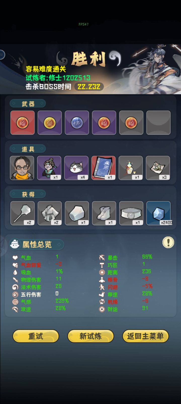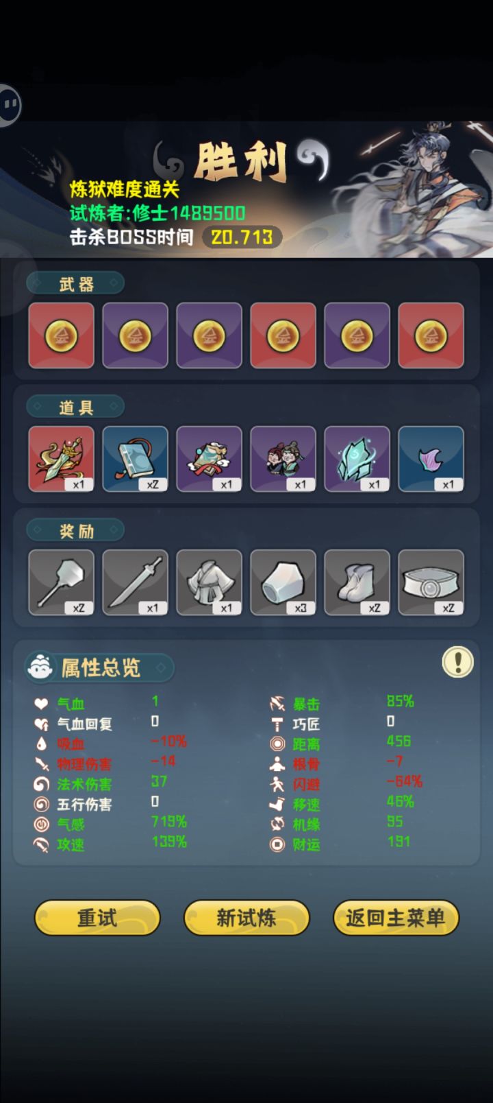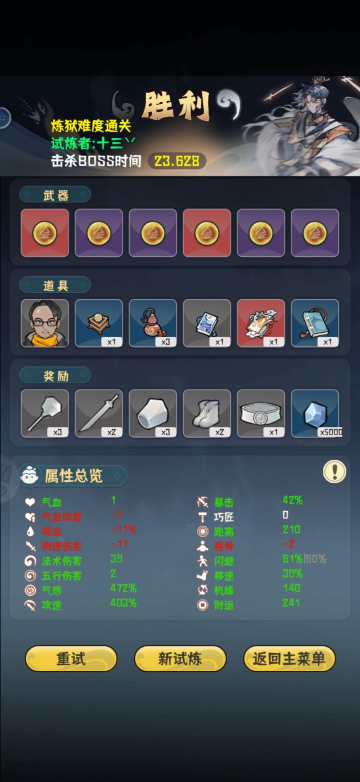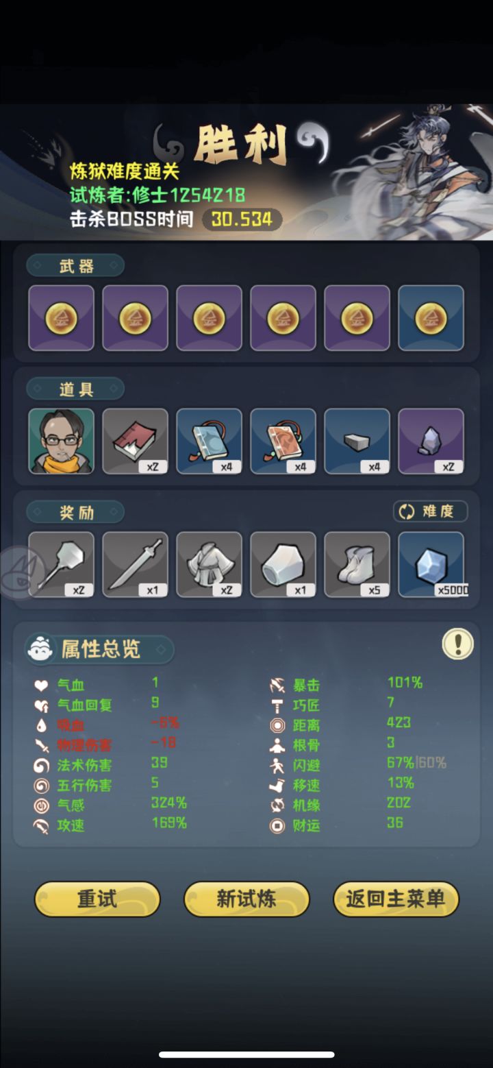 看属性就知道本人手残党,所以这是给手残党的我个人一些心得。前期思路是优先叠攻速,气感有“有病”的道具加成,攻速起来后气感也就自己起来了,气感起来一点点以后开始买加闪避的道具,十五关前尽量把闪避加到50左右,然后期间法术伤害,移速啥的杂七杂八的,看刷到啥就买点。十五关是个分水岭,运气好的话刷到减怪物数量的就容易很多,这关思路就是躲子弹,钱就不要想着去捡了,盯着子弹弹道去躲。BOSS关把红色那个秒掉基