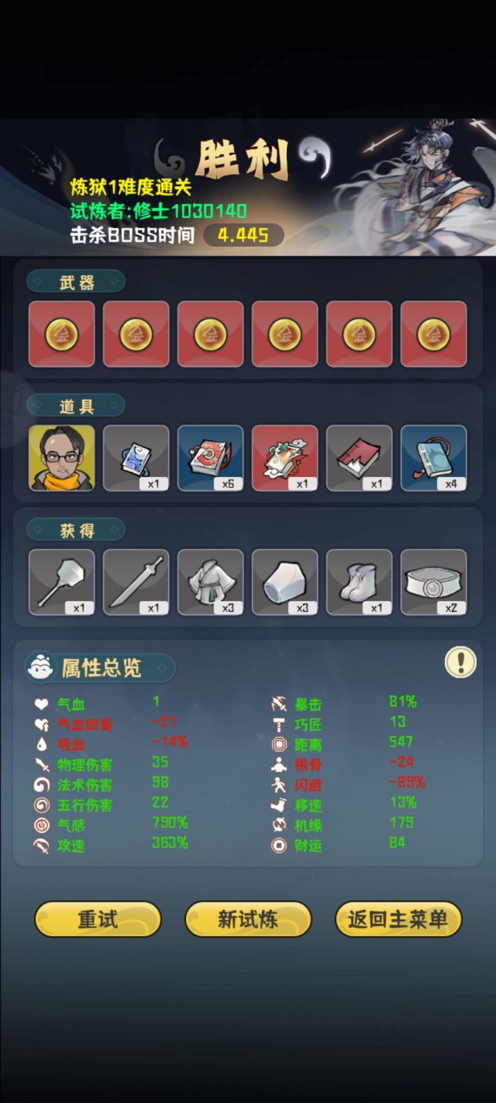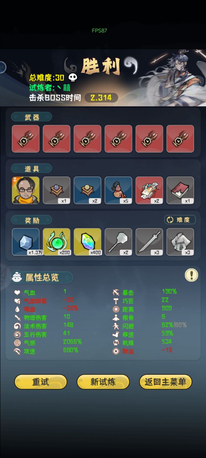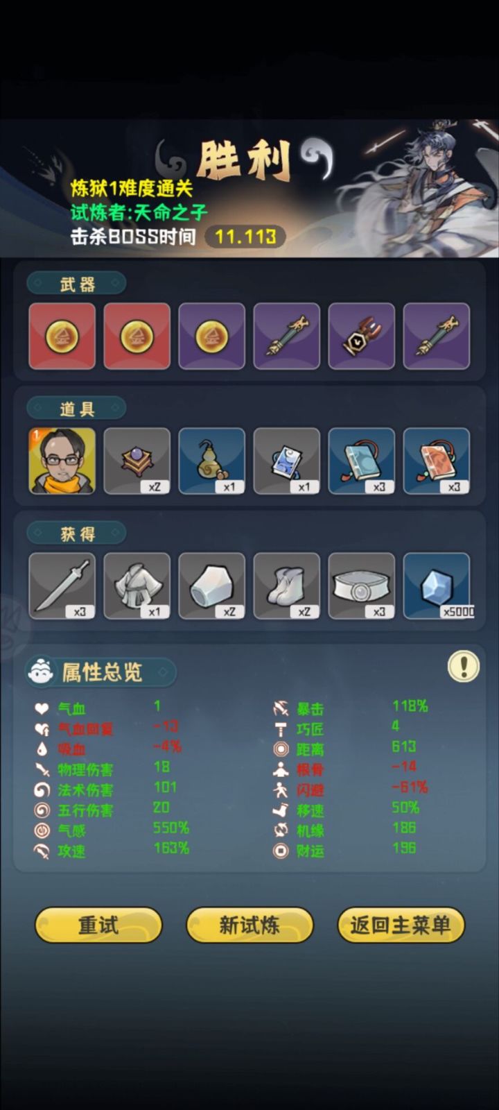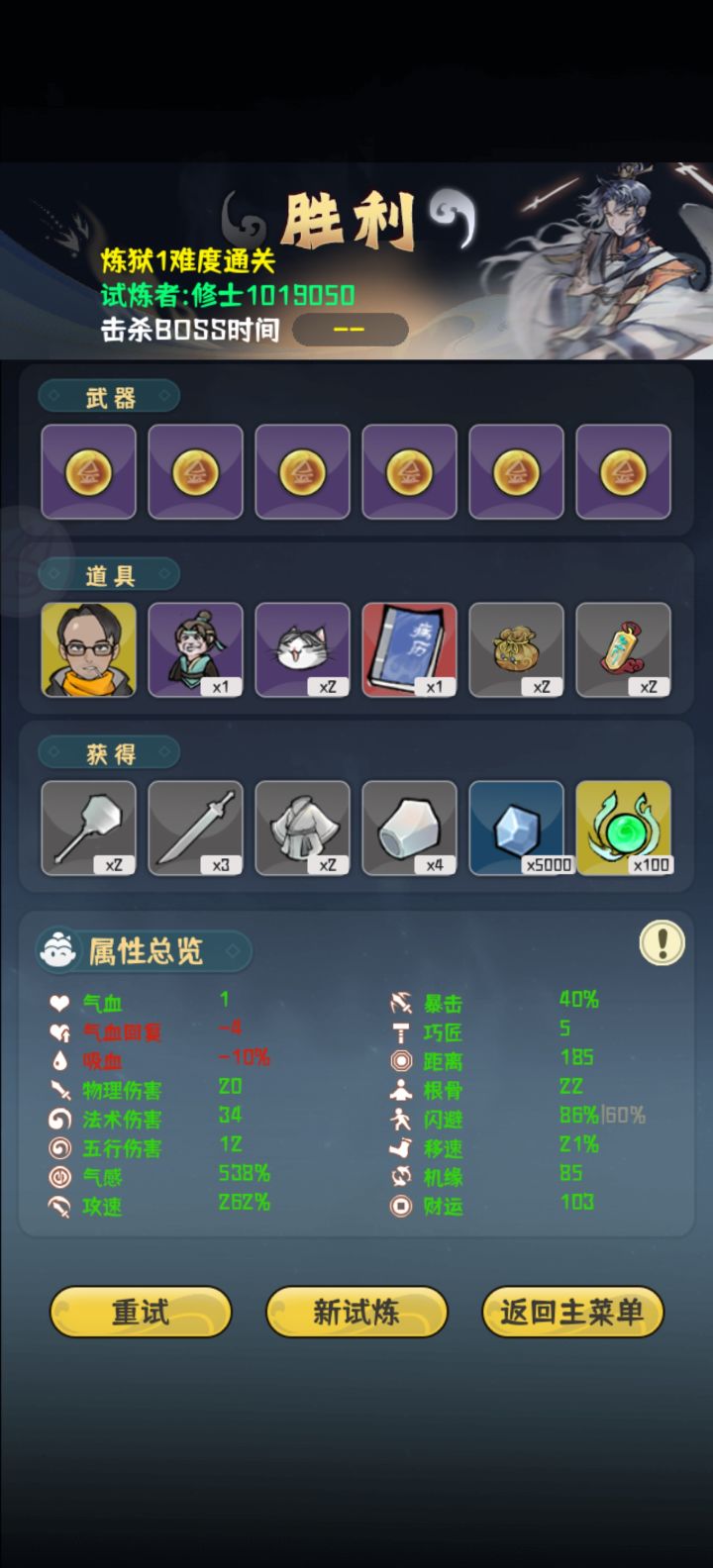 看属性就知道本人手残党,所以这是给手残党的我个人一些心得。前期思路是优先叠攻速,气感有“有病”的道具加成,攻速起来后气感也就自己起来了,气感起来一点点以后开始买加闪避的道具,十五关前尽量把闪避加到50左右,然后期间法术伤害,移速啥的杂七杂八的,看刷到啥就买点。十五关是个分水岭,运气好的话刷到减怪物数量的就容易很多,这关思路就是躲子弹,钱就不要想着去捡了,盯着子弹弹道去躲。BOSS关把红色那个秒掉基