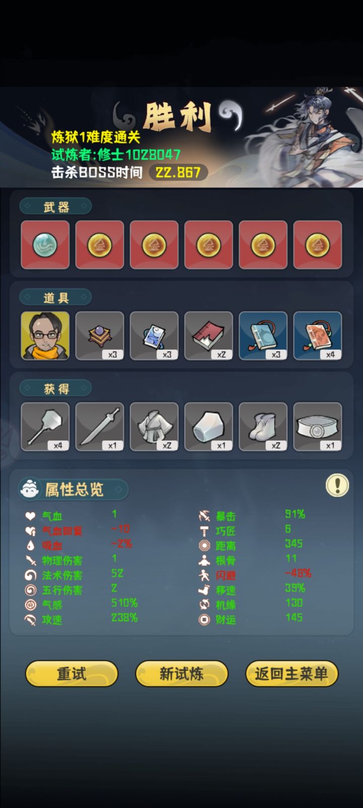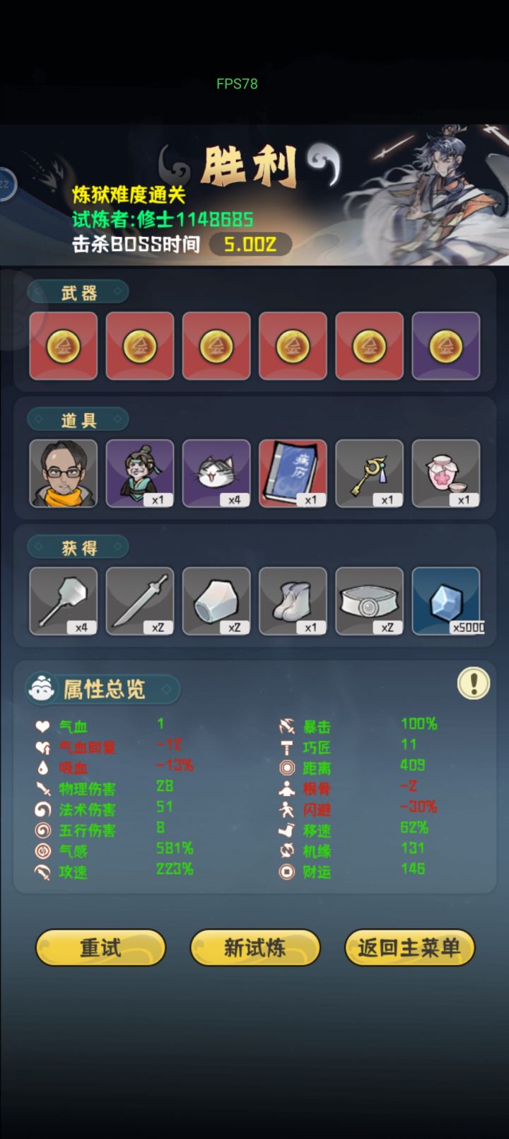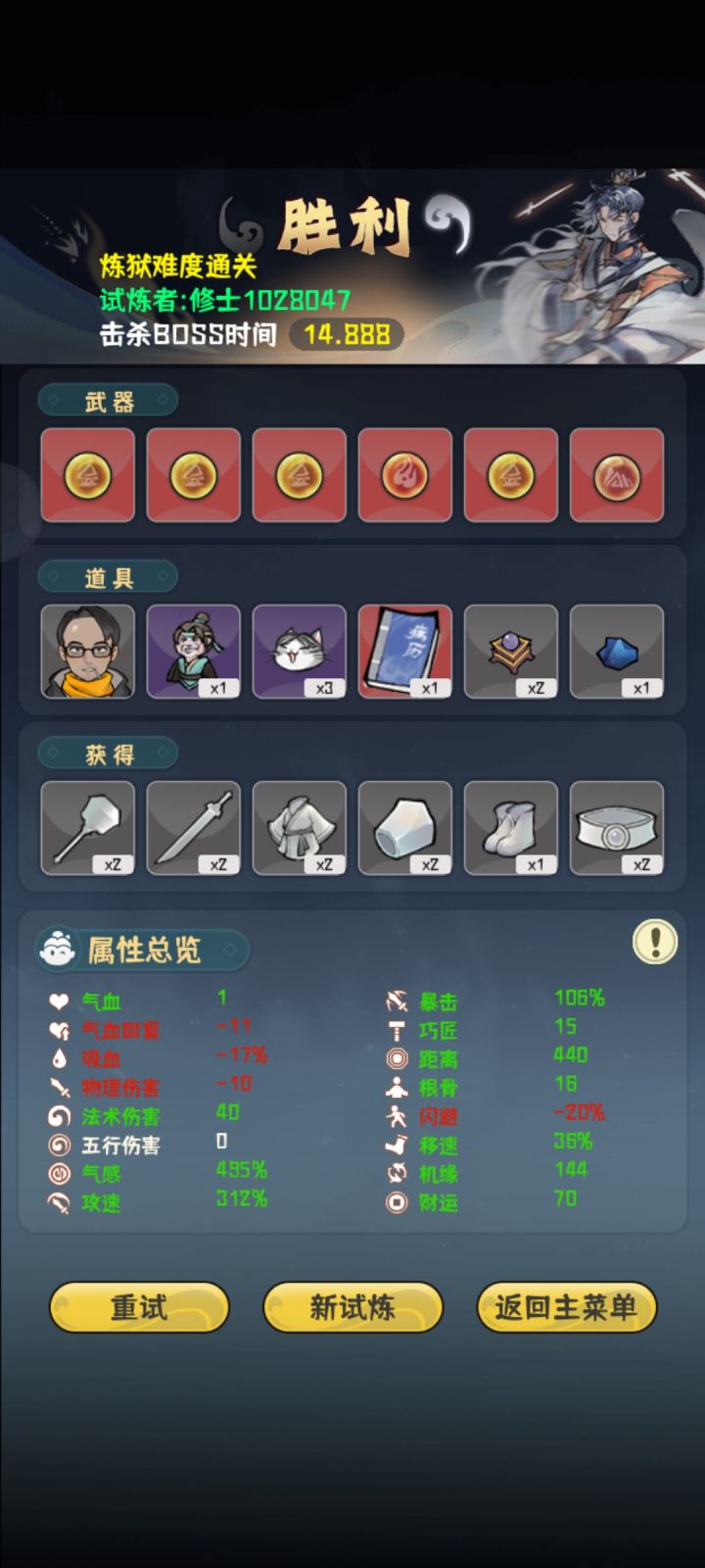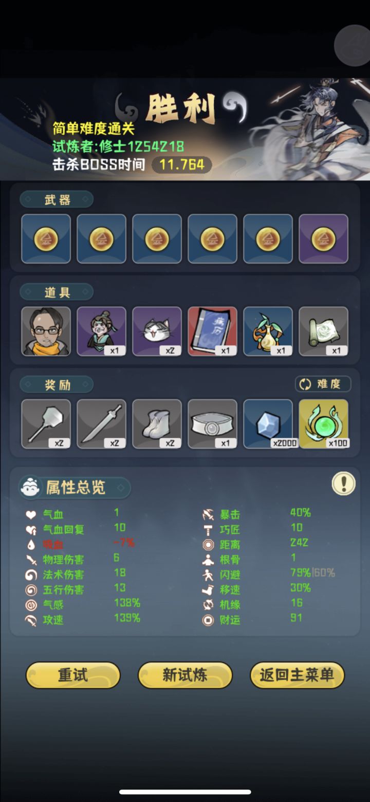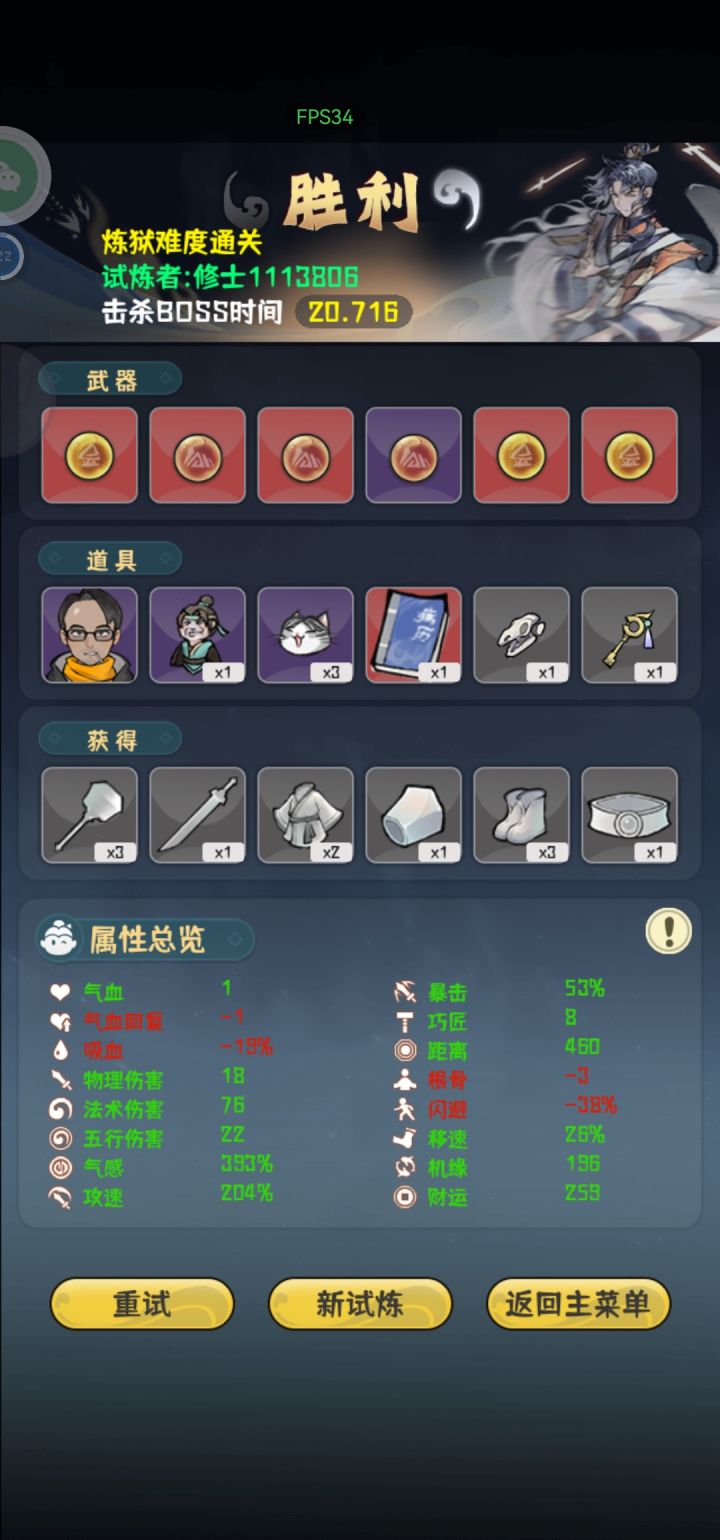 真就全程高压,高机缘是前期想抽剑匣的结果等到最后也没有,就直接无脑堆气感了最后一下伤害六百好像记不太清,boss面还没看到就没了,就是太费眼了,攻速高了跑起来犯病追着跑,有时候容易挡住子弹,策划能优化一下就好了,眼快没了。