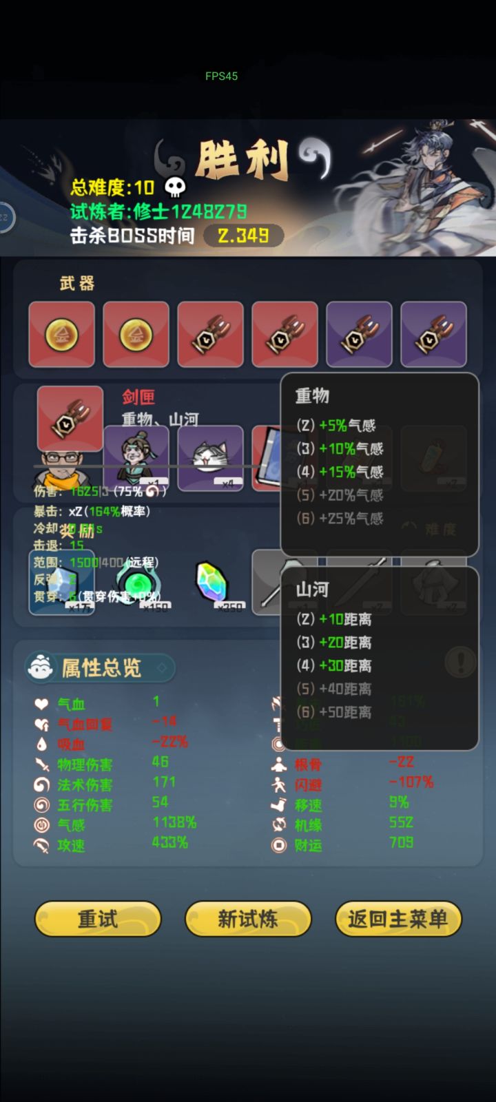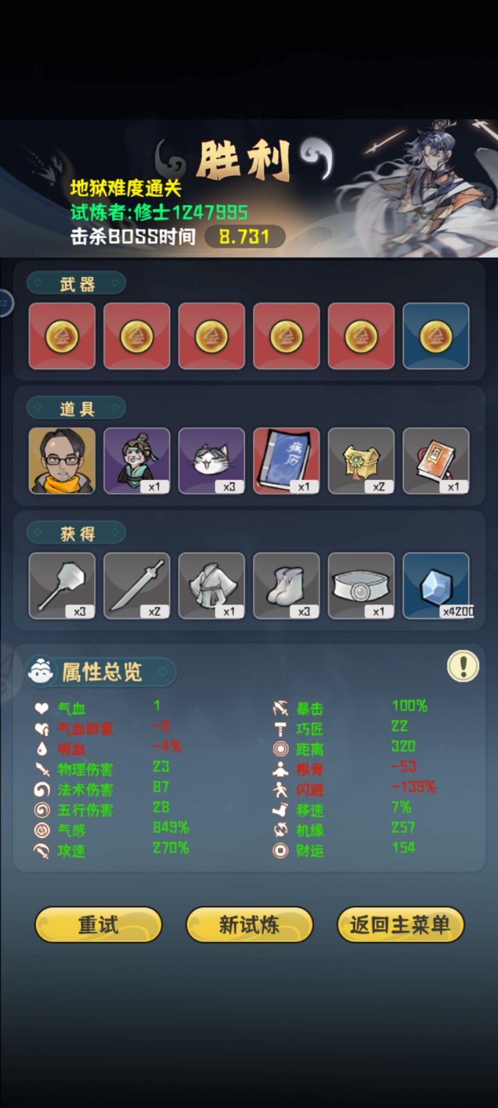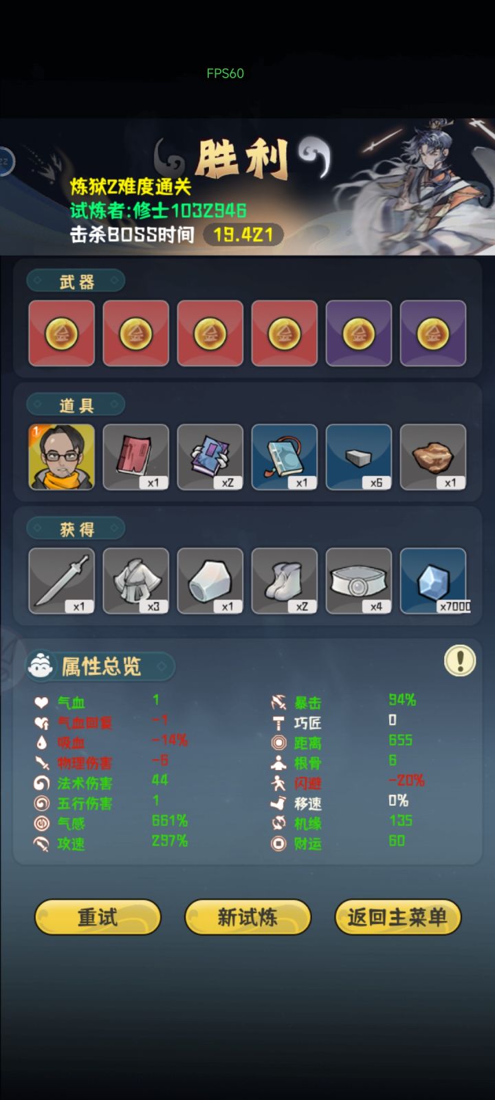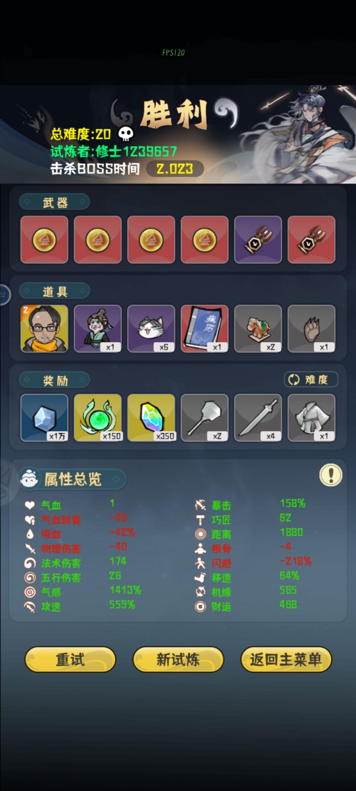 真就全程高压,高机缘是前期想抽剑匣的结果等到最后也没有,就直接无脑堆气感了最后一下伤害六百好像记不太清,boss面还没看到就没了,就是太费眼了,攻速高了跑起来犯病追着跑,有时候容易挡住子弹,策划能优化一下就好了,眼快没了。