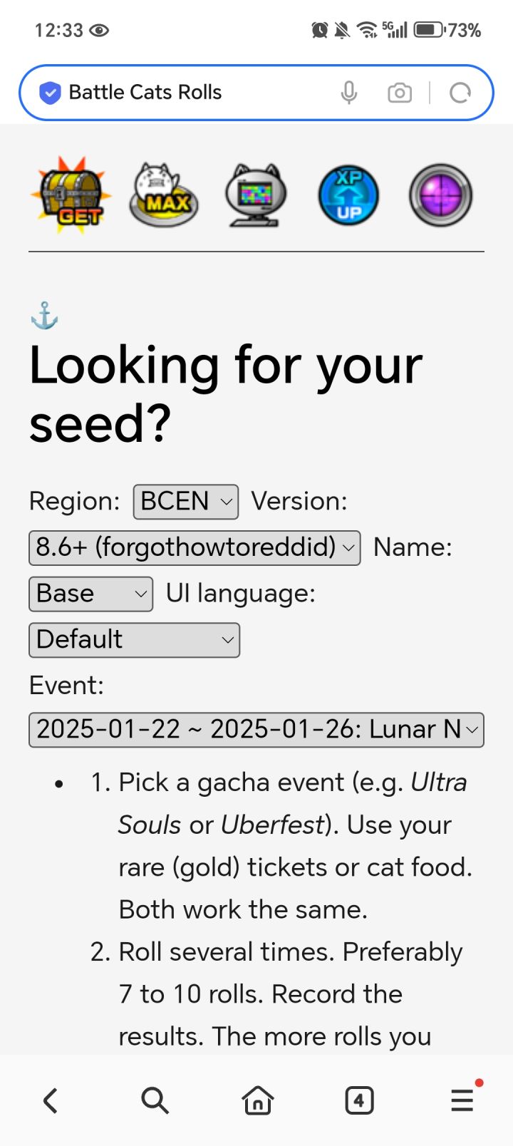 如果过多人对此持抵制态度本人会删帖先上测线网址https://bc-seek.godfat.org/seek一 什么是测线猫战这个游戏在你创号的那一刻起,你之后会抽到的不同稀有度的猫的位置已经固定了,不同的池子只是猫咪之间的替换,你这个号之后能抽到的所有猫就是你所在的线,而测线就是让你看到你之后会抽到的所有东西二 怎么测线打开上面的测线网址Region(地区)选择你的服务器EN为美服