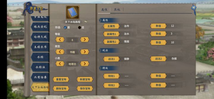书籍篇(欢迎补充)未完待续武器篇–––––分割线系统介绍,不定期更新书籍(军事类,有些书籍并不是兵书)我国古代的军事类相关书籍编辑完毕,欢迎各位补充,现代和国外的以后看情况再做。书籍(水利类)加能力原则:1 全国性的水利著作比区域性的水利著作加能力多2 字数多的相对能力加的多,毕竟几千字的作品也不可能有太多内容3 因为水利对农业有巨大作用,所以多少都会加一些治农的数值基本上