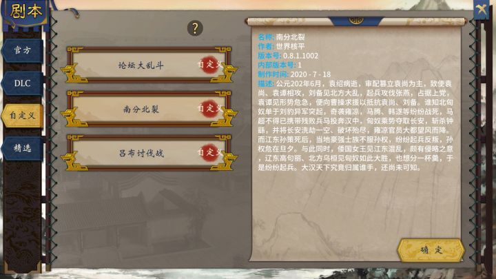 虽然现在有开机闪屏的问题,但是快速地切换一下桌面重新登陆就能完美解决,我还是选择了修改安装包。游戏,就图个爽,后续我会将《乱世开端》和《群雄讨董》直接替换官方剧本,奉先剧本最终章《千秋霸业》也会通过修改安装包而进到精选剧本,到时候直接下载安装就可以玩了,非常简单。大家敬请期待。现在最后一季《千秋霸业》框架已经完成,需要完善的是人物简介、数值调整、宝物设计、立绘增添。另外,奉先剧本安装包将实现存