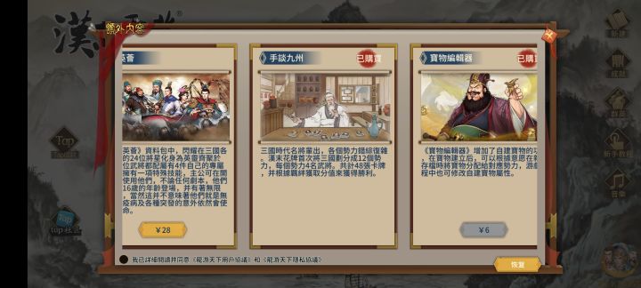 1 商店不再刷新 2每隔三月只出现新的任务但是不刷新在野武将 3 自虎牢关往后的剧情每次攻城的胜利条件均为击败程远志 4 委托任务与正常任务所捐的兵力 钱 装备捐完后仓库并未减少 目前已经打完下邳之战 望贵公司尽快修复bug并更新新的篇章 如有其它bug问题欢迎大家补充