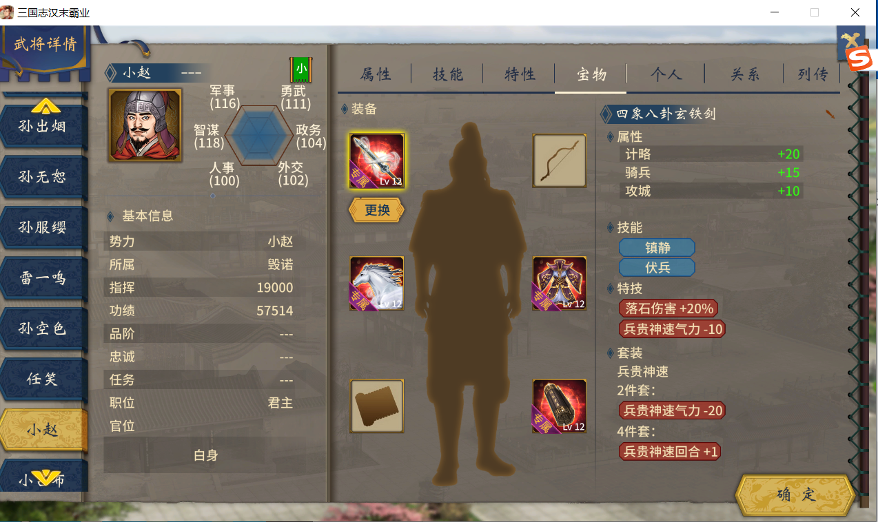 大佬们,兵贵神速套装不生效如图,steam版本,自建武将单手武器,4件齐全,DLC龙腾虎啸没有购买,目前steam免费可用,是出BUG了吗,Steam正版游戏也没有改过文件,我只是想凑齐套装玩的爽。。。