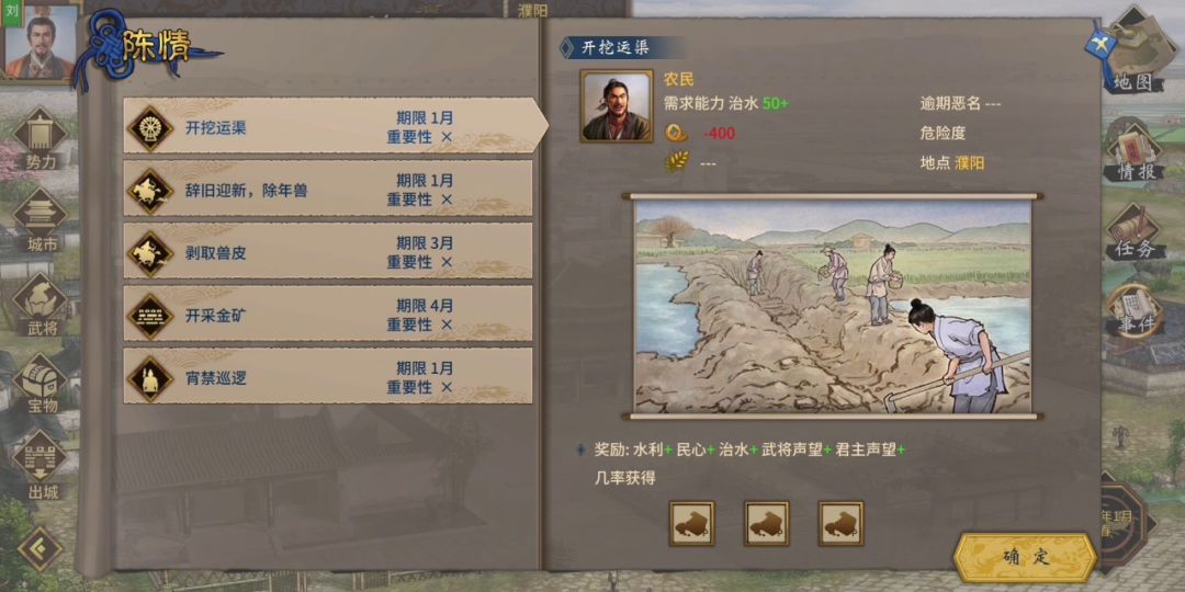 经济: 来源——主要靠攻城.山寨异族.俘虏。 使用——前期科技内政陈情都不用做(性价比极低且资金紧缺!),钱主要买两样东西—粮草和茶,保核心武将忠诚度。中期有钱了科技先开投石机和床弩,再开增加粮食收益的,其他的随便。陈情只做O和能加武艺经验的(让用来打武道大会的武将去做)(粮草紧缺提前用召唤令召商队,万不得已才借粮) 战斗: 只能手动,条件允许的话优先打有玉玺的君主,提高登庸率。战斗要注意以下几点
