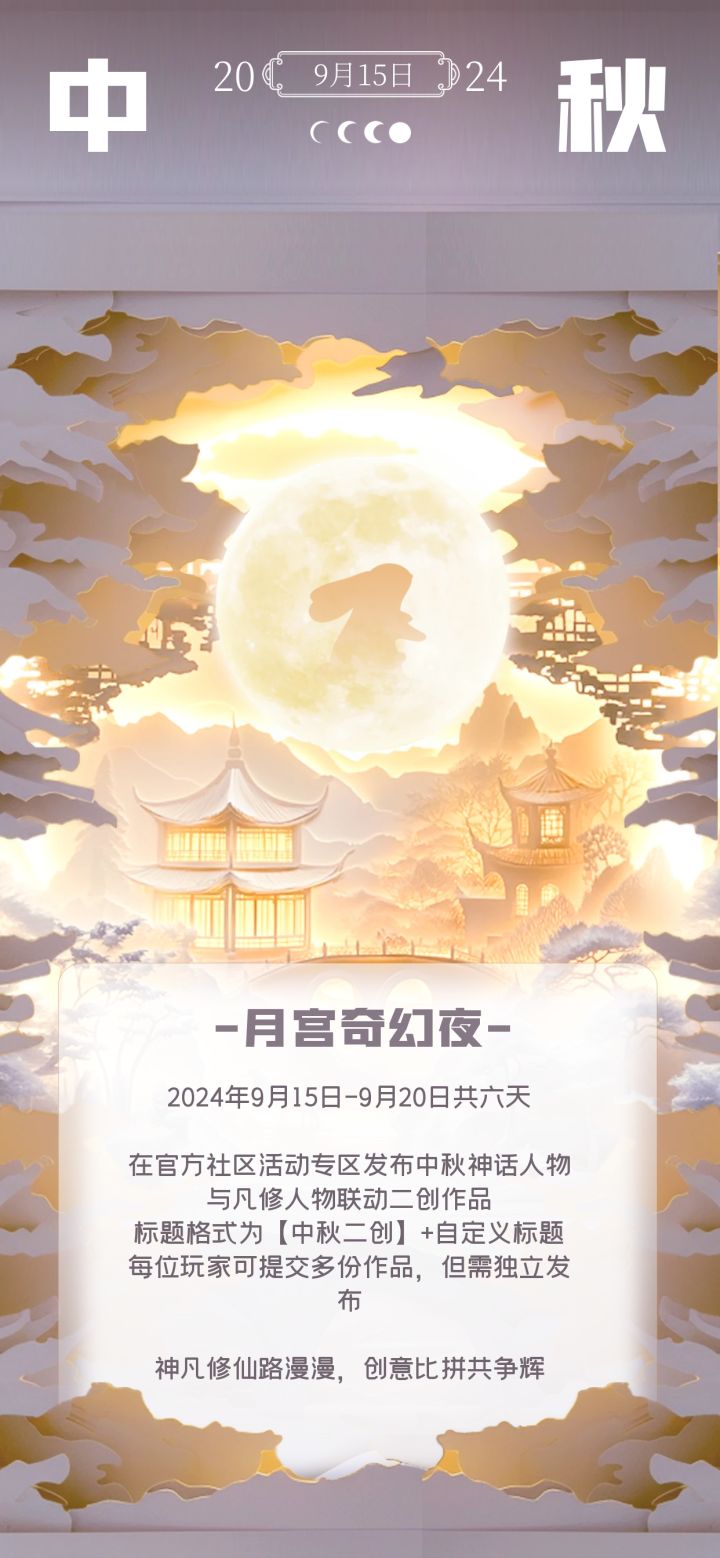 ✨韩立在远古遗迹中捡到一枚神秘玉佩,玉佩上刻有月宫图案和古老符文。经过多日研究,韩立发现玉佩竟是通往月宫的钥匙。怀着好奇与期待,韩立激活玉佩,瞬间被传送到了月宫……✨🌕活动时间🌕📅开始时间:9月15日 📅奖励公布:9月20日🌕活动内容🌕以“中秋神话与《凡人修仙传人界篇》”为主题进行二次创作。将嫦娥、吴刚、玉兔等中秋神话人物与凡修角色和故事结合,创作独特的故事、绘画等作品。🌕参与方式🌕1