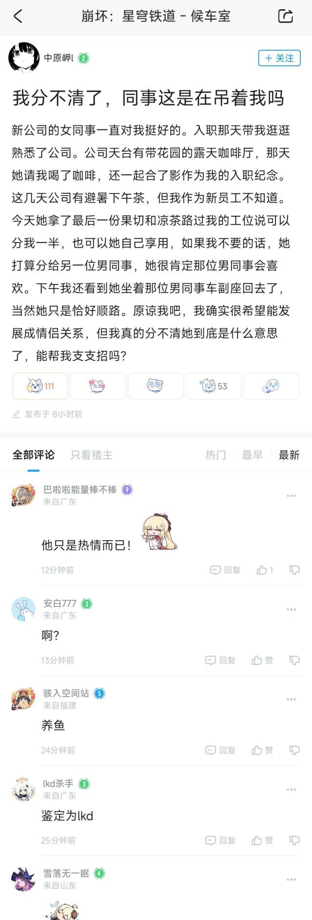 排雷:崩坏星穹铁道的玩家最好不要看,有不适内容。隔壁论坛有人用崩坏星穹铁道女角色的剧情钓鱼,看看现实生活中感情经验丰富的老哥们面对这种女性会做什么判断?结果被社会经验丰富的老哥们反复劝告:劝告分析1:这是恋爱段位很高的女猎手在养鱼!她提及另一个男同事,是简单测试你的情场经验,对她有没有好感。做坐别的男性的车回去,是看会不会做出比那些男同事更大的牺牲,适不适合当舔狗.而不在服务区就是根