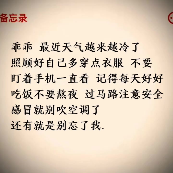 乖乖 最近天气越来越冷了 照顾好自己多穿点衣服 不要 盯着手机一直看 记得每天好好 吃饭不要熬夜 过马路注意安全 感冒就别吹空调了 还有就是别忘了我.