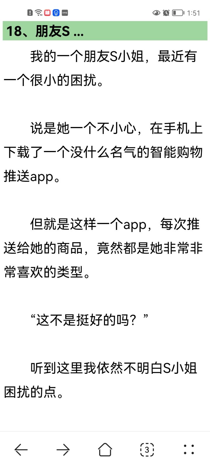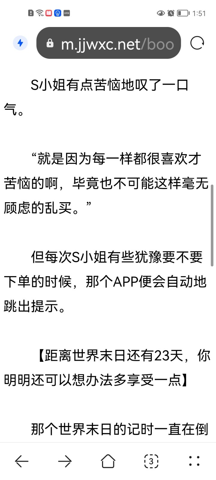 一般来说,我只会发一天发一个帖子,但是今天我真的很想再发一个帖子,真的,我今天看了一个脑洞故事,真的是可能是我没看过这种类型的,大受震撼,但我带不上脑子,所以没觉得恐怖,我只能看懂,就是如似我闻(也有可能名字记错了)那个作者的一篇言情短篇小说,就晋江文学城就能看,就是停止的时间,重复的轮回,以及每天逐渐崩溃,瓦解的精神,啊,女主真的,运气太不好了,希望她早日从那个地方出来,哪怕就一个平行世界的她