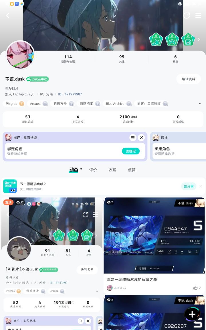 网名:不语.dusk(改名了emmmm)年龄:刚满十五岁性别:♂身高:175主攻游戏:粥,phi,Arc(主),phr(又菜又爱玩)音游龄:8个月(期间略有退坑)目标:Arc双摘(预计1年)phi rks15.5(随缘)注:因为中考等原因,不得不减少游玩时间(B学校一周回来一天)(体考物化生实验IT已PM)爱好:数学,音游,音乐,吉他,画画不知道写啥了,暂且这样#游戏日常