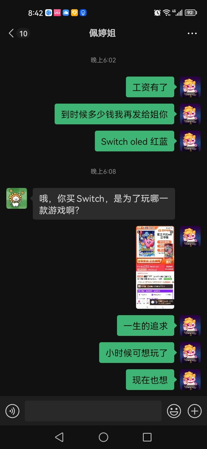 深圳打工第七十二天发工资了,我的工资只有三千而已,没有三千六,然后就是想拿这笔钱买Switch oled,然后在上面玩星之卡比Wii,因为这是我小时候的梦想,不管怎么样我都想玩,贵也无所谓,因为这个和家里人说了很多,他们大多数话都是在劝我,而不是来问我为什么要买这个,老妈跟我说以后再来买,现在好好打工赚钱,这和让我好好读书以后再来买不一个意思吗,为什么这种话术现在还在用,人生苦短,现在有钱了为什