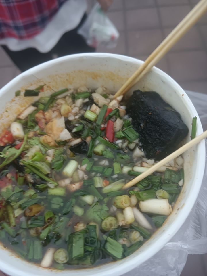 我人傻了,第一次看到臭豆腐一点馅料都不塞直接在油里炸然后把臭豆腐剪成两半在汤里直接放馅料的