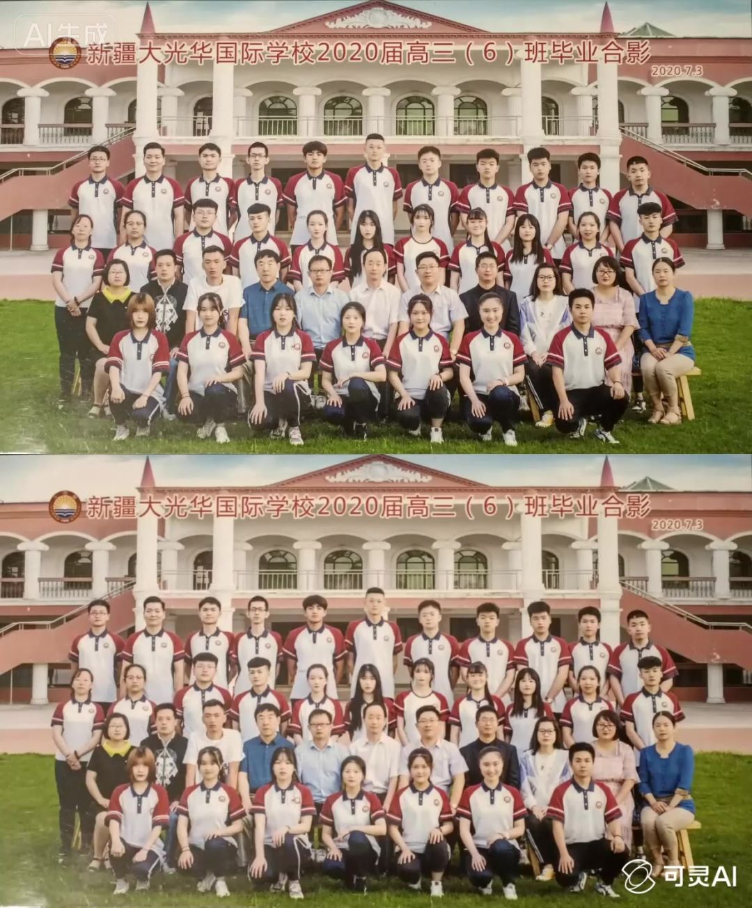 自己高中毕业合影 老照片动起来特效 上半部分是参考图(用手机拍的照片) 自己高中时候的毕业合影 (备注左下角是照片因为照片塑封导致的照片反光,不是烟雾) 下半个是生成视频特效 老照片动起来特效 毕业合影照片右上角2020年7月10日星期五
