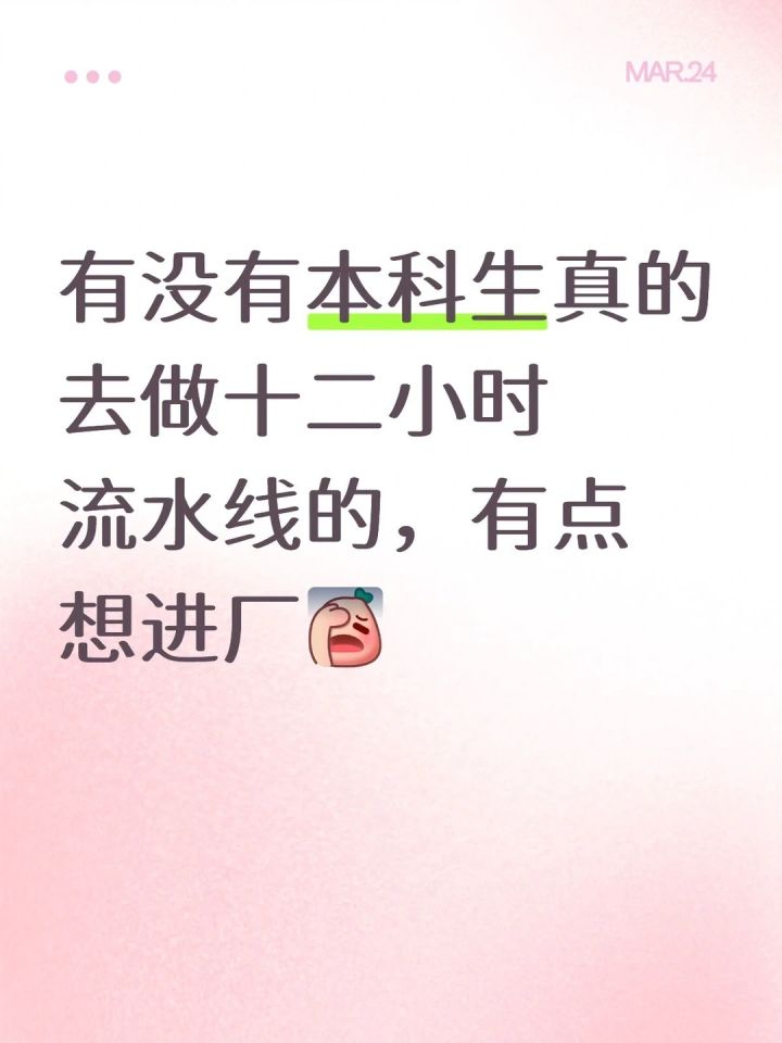 求问!本科生做12h流水线,真实感受&建议全征集! 最近被就业环境狠狠焦虑住了😭 招聘软件翻烂,要么薪资低到养不活自己,要么坑多到踩不完,刷到好多本科生进厂的帖子,真心想蹲一波最真实的反馈!#吐槽#生活杂谈