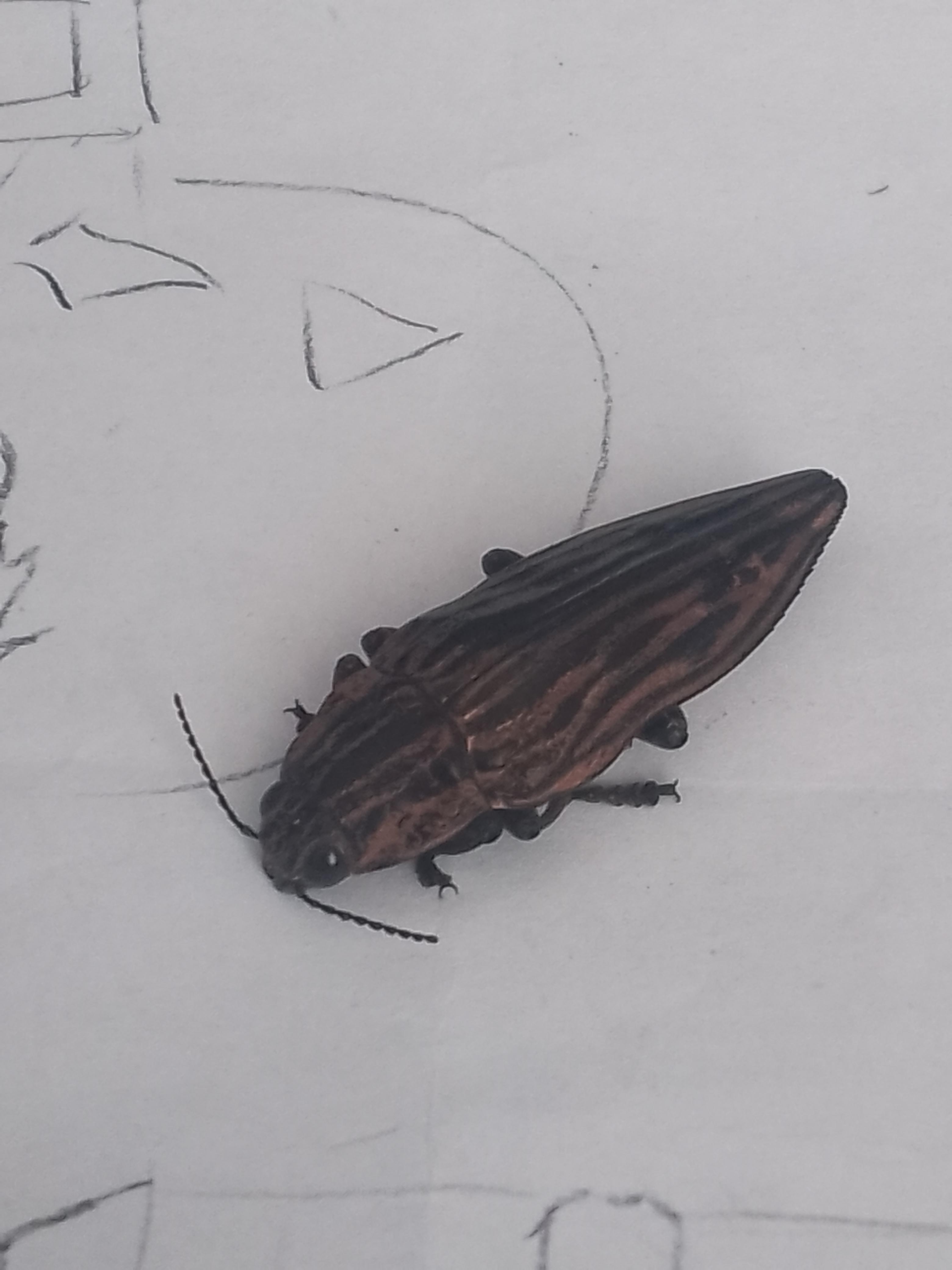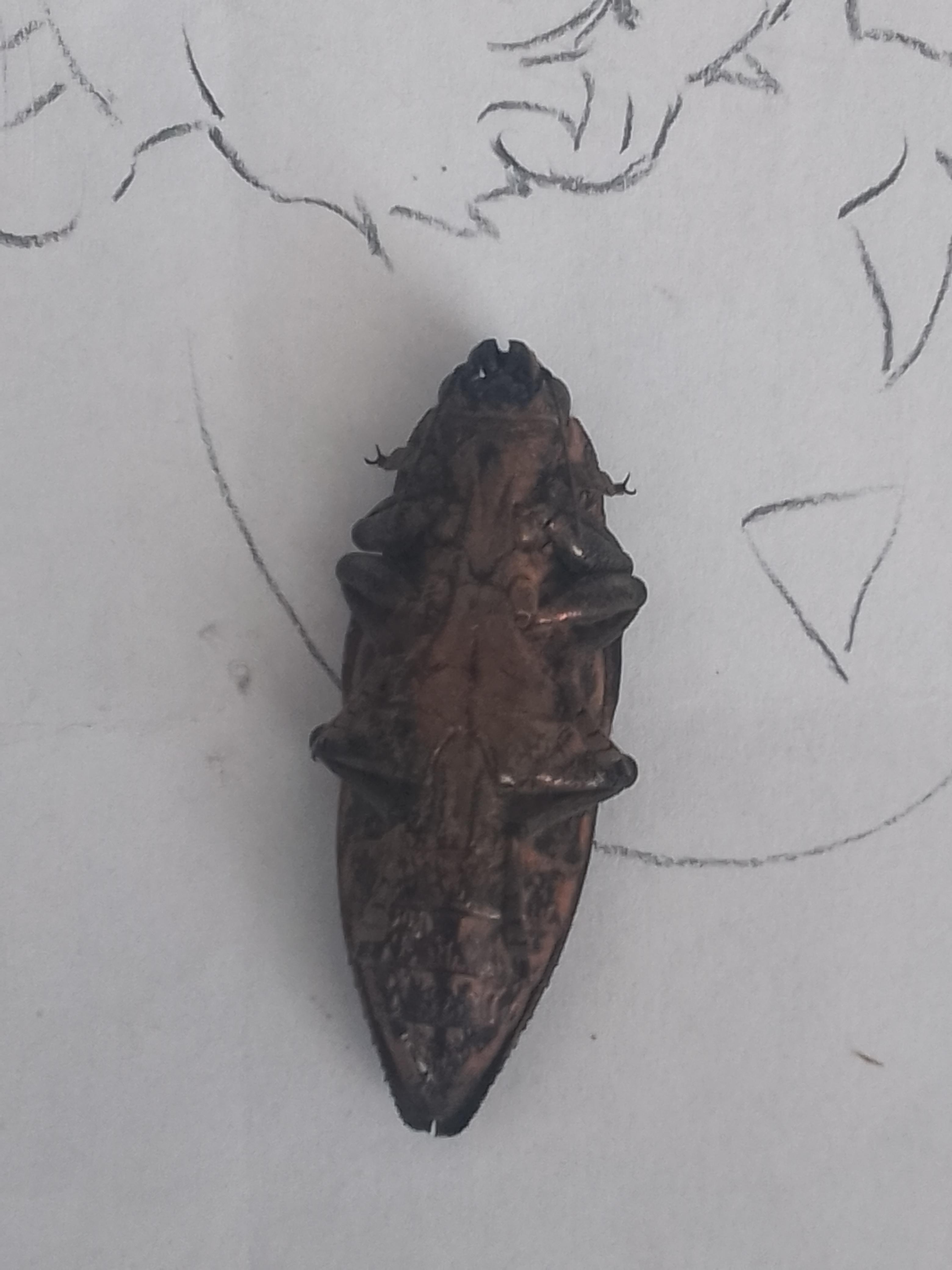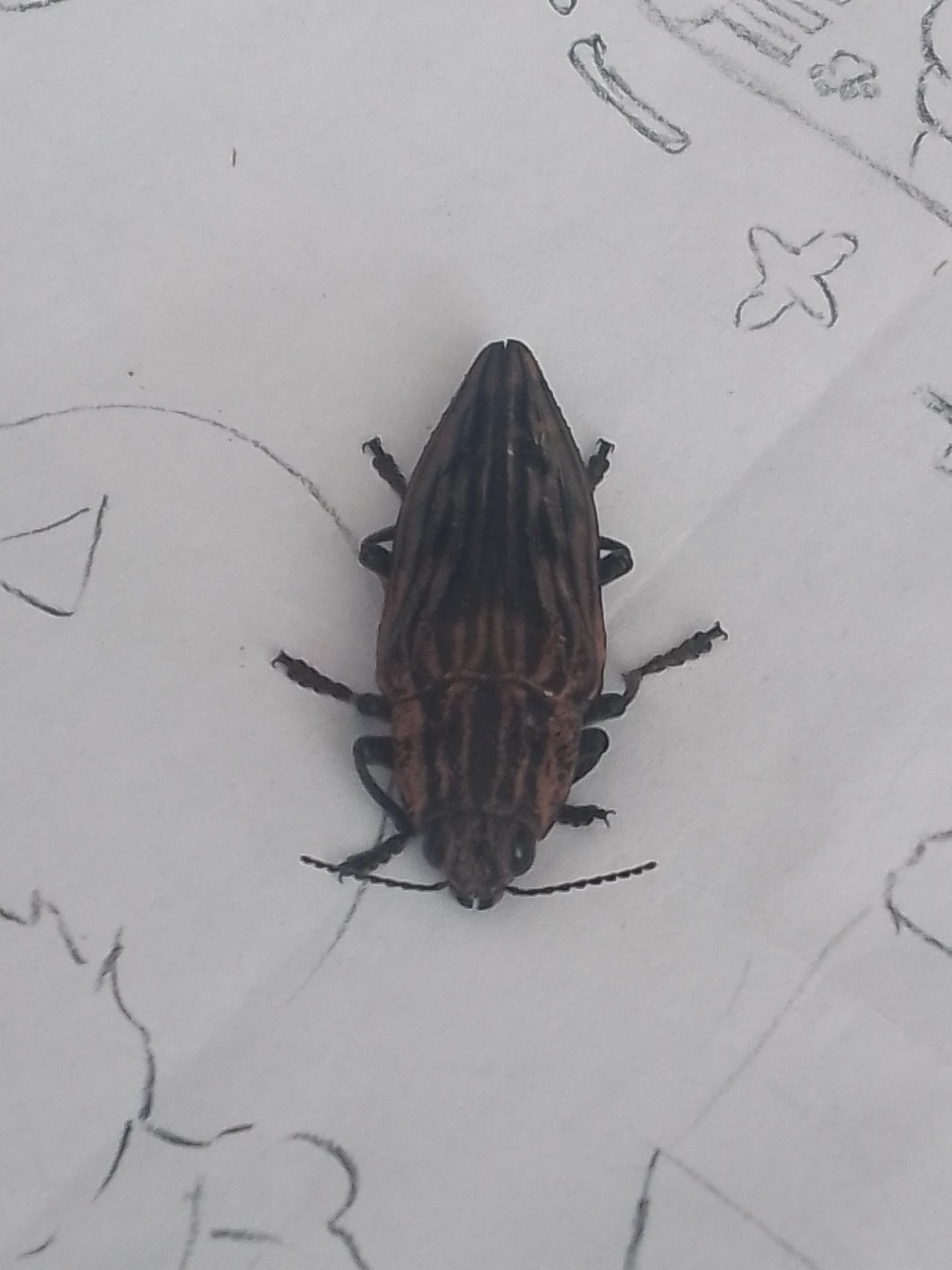 路边捡到的,像蟑螂但又不是,扁长椭圆形,体长4cm左右,宽1.5cm左右,高不足1cm,触角1cm左右,眼睛圆黑,直径不足0.5cm,牙齿像天牛但没那么大,通体古铜色,背甲有黑色树皮纹,很胆小,稍有动静就把触角和手脚缩壳