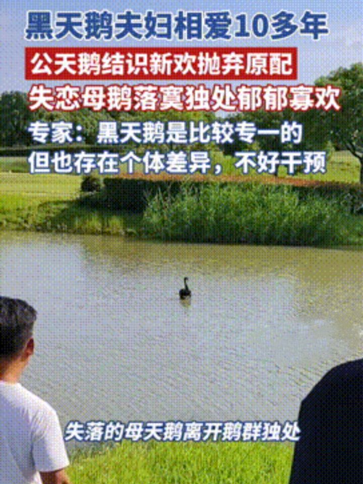 湖北武汉,一对黑天鹅相爱10多年,公天鹅突然移情别恋脱离鹅群,爱上了一只新的母天鹅。遭遇“爱情背叛”的母天鹅也脱离鹅群,回到它与公天鹅曾经约会的地方独处,其孤单的身影令人唏嘘。饲养员在湖边抓了两只英俊的公天鹅介绍给母天鹅“作伴”,希望它们能培养一下感情。然而,伤心的母天鹅拒绝了饲养员安排的“相亲”,仅半天过去便逃离了这片水域。远离渣鹅!!!#生活杂谈 #迷惑行为大赏 #资讯评论员