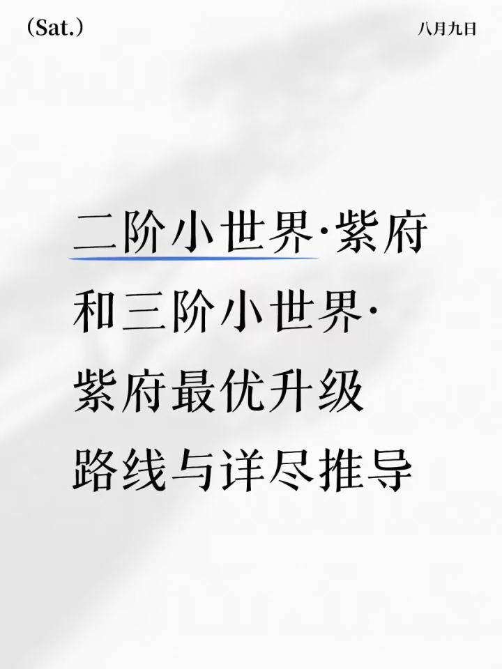 前言继发布后,本篇将继续分享二阶小世界·紫府及三阶小世界·紫府的最佳升级方案。一、最佳升级方案一览由于二、三阶的计算过程极其繁琐,我将先直接给出结论,有兴趣看了解怎么推导的可以看第二章。一阶小世界·紫府:9品31%二阶小世界·紫府:10品36%三阶小世界·紫府:10品41%说明: 四阶小世界紫府因涉及灵地升级、百分比提升、品阶提升及开地数量等关键数据缺失,目前无法进行有效计算。别问为