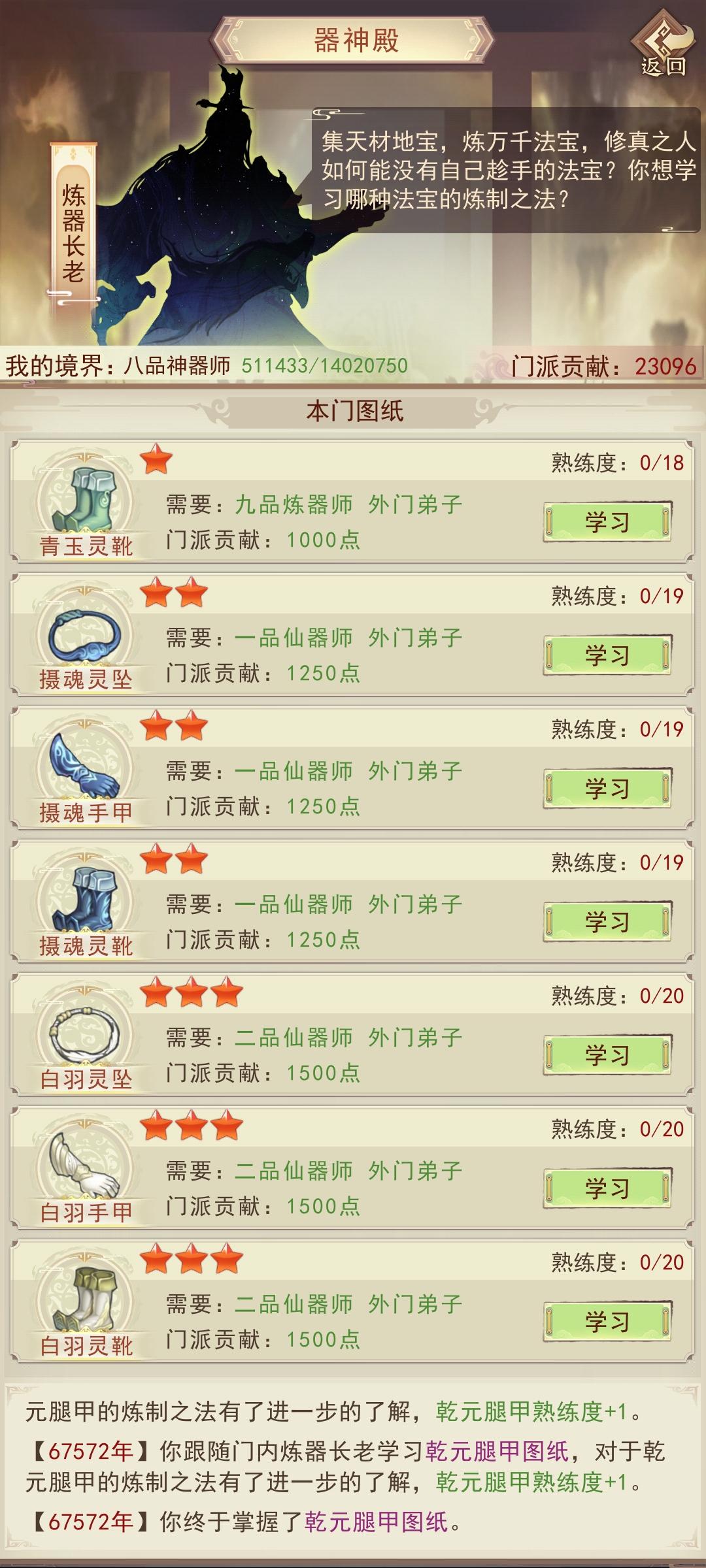 能在器神殿加上所有法宝的图纸吗,现在不回仙宗的话没法炼手、腿、链了,回仙宗又会调进度。求求官方看一眼。