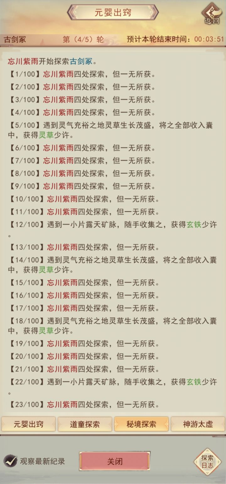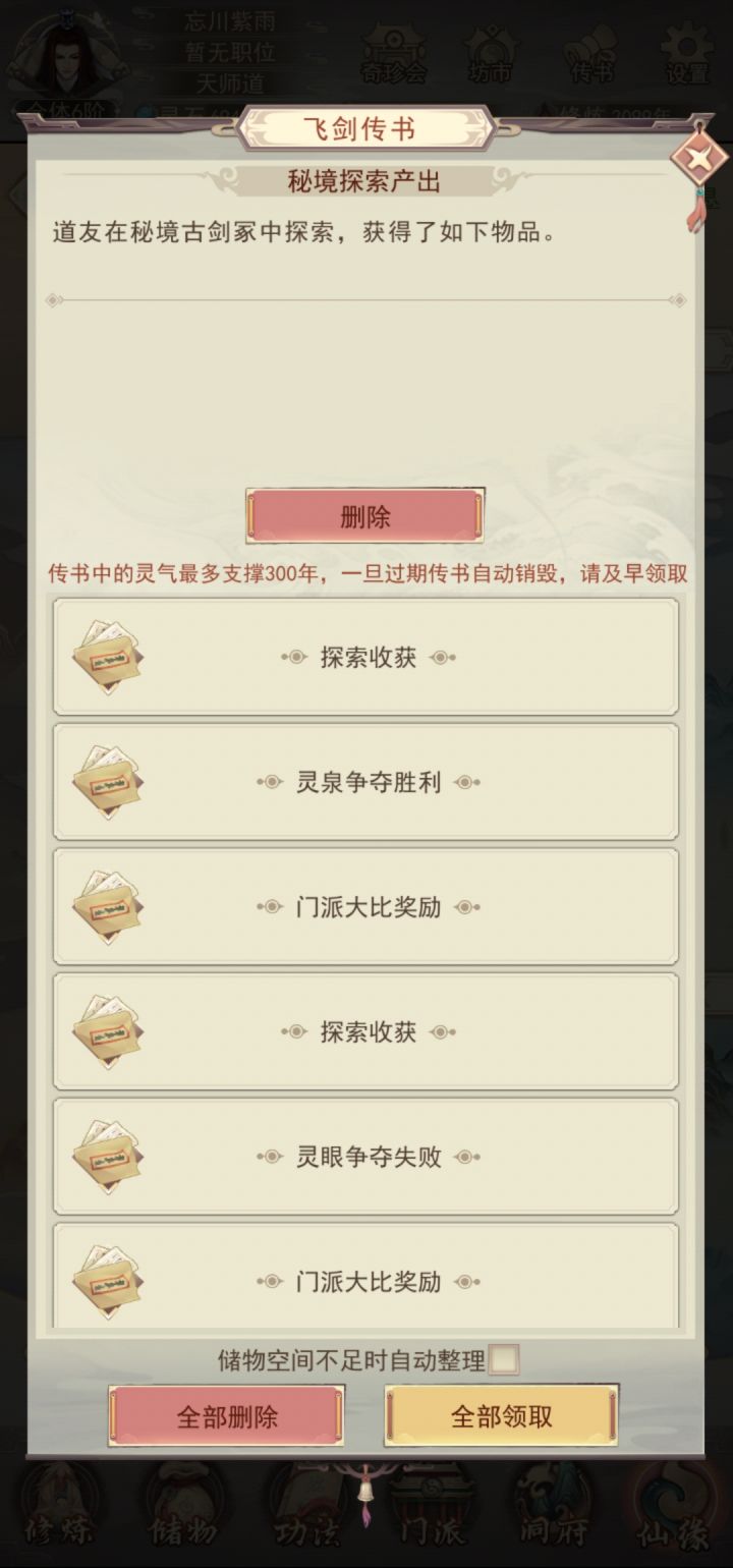 这两天凡间五图的秘境探索的收益怎么没了啊就只给我10颗忘忧草。明明再探索,但是飞剑传书就收不到了。