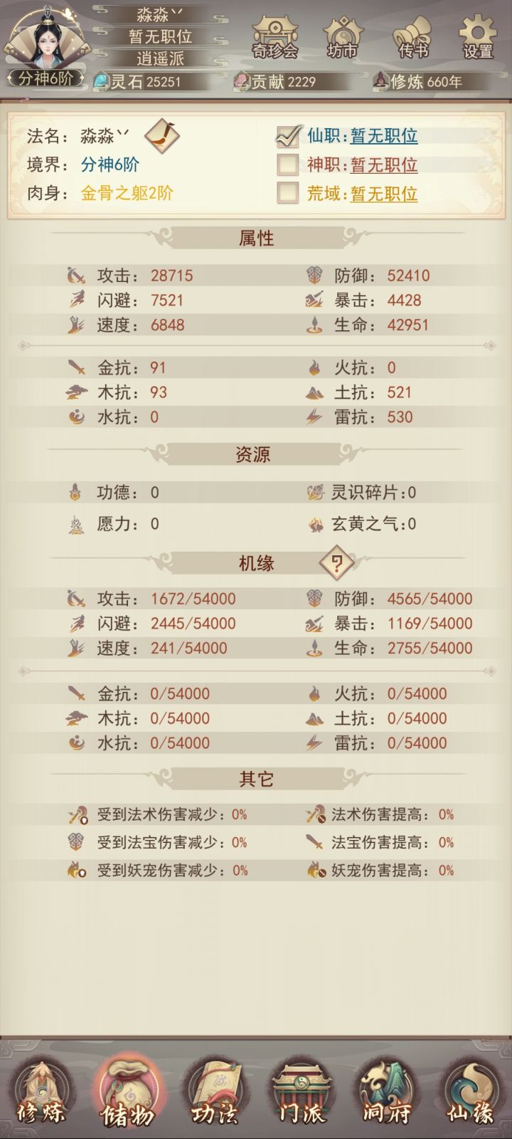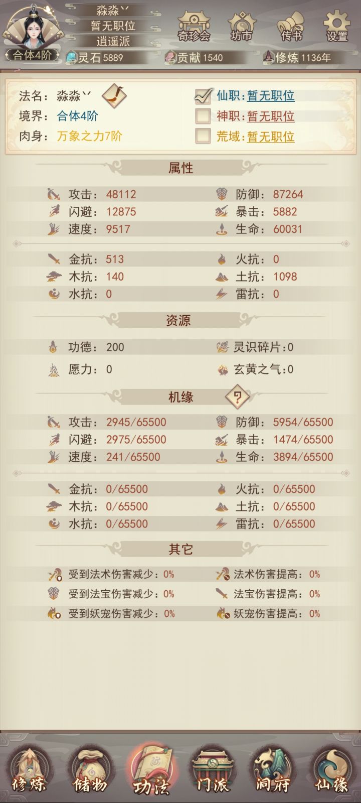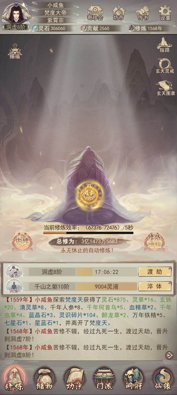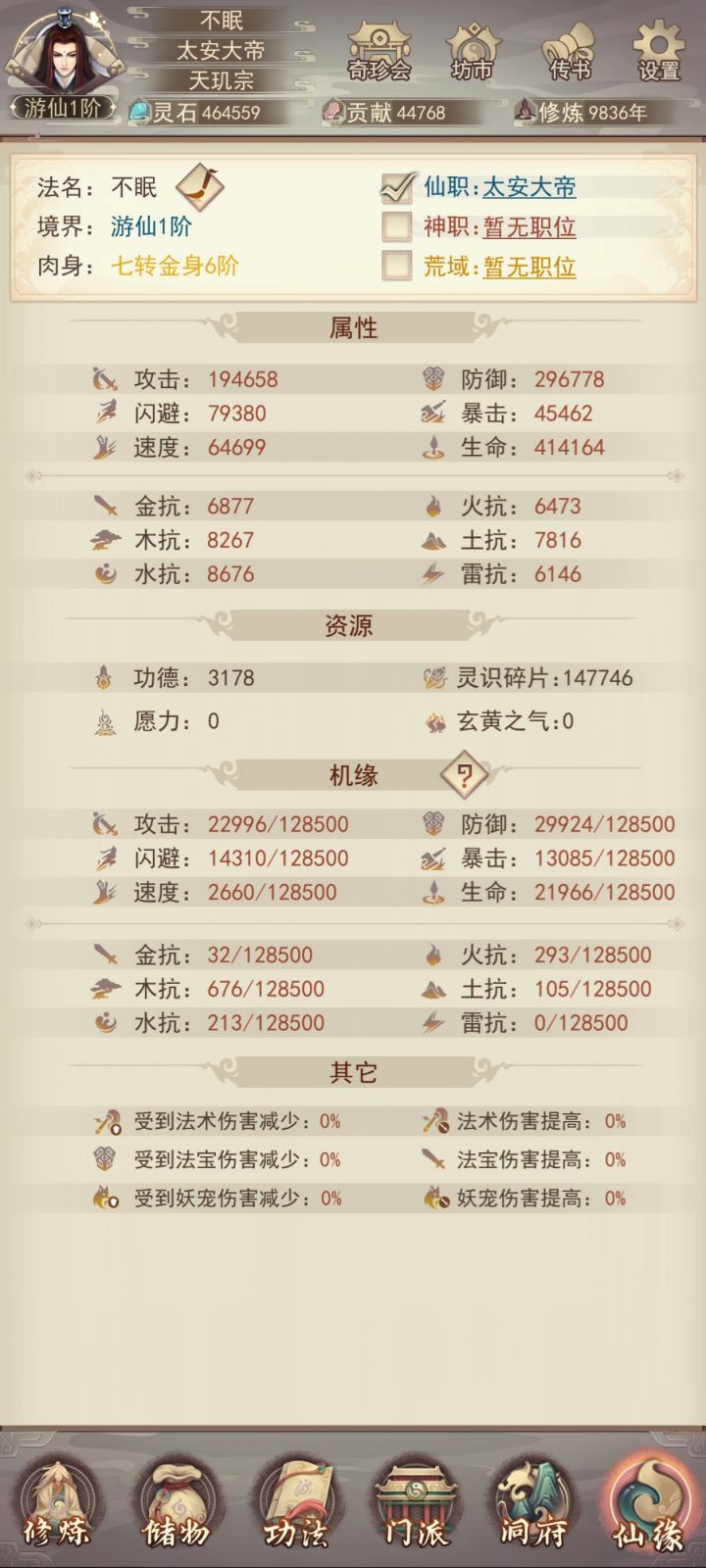 时隔6天再更新一下目前进度。明天晚上应该可以自己打上天了(vivo渠道没有氪佬接引上天只能自强了)。目前装备衣服6星,头和腿5星,其他三星;宗门还差5本攻决,仙术坊还差3-4本心法,等明晚我再继续更新进度叭。