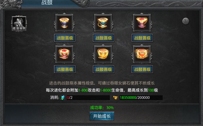 战鼓规则说明1、到达第六大陆后开启战鼓进化功能,战鼓进化可获得大量成长属性加成2、消耗女娲石、元宝可提升战鼓成长等级3、每次进化都会附加1-800攻击和1-8000生命值,最高成长到100级4、进阶下阶战鼓后属性可获得继承5、购买战鼓秘术可使战鼓进阶成功率达到100%#攻略