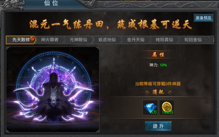 规则说明1、提升仙位,可提升神力属性。2、仙位等级越高,可穿戴神奇件数越多。最多可穿戴10件神器。3、升级仙位消耗钻石、龙币。4、佩戴仙器可大幅提升属性,并获得特殊效果。5、人物达到15转300级开启仙位功能。#攻略