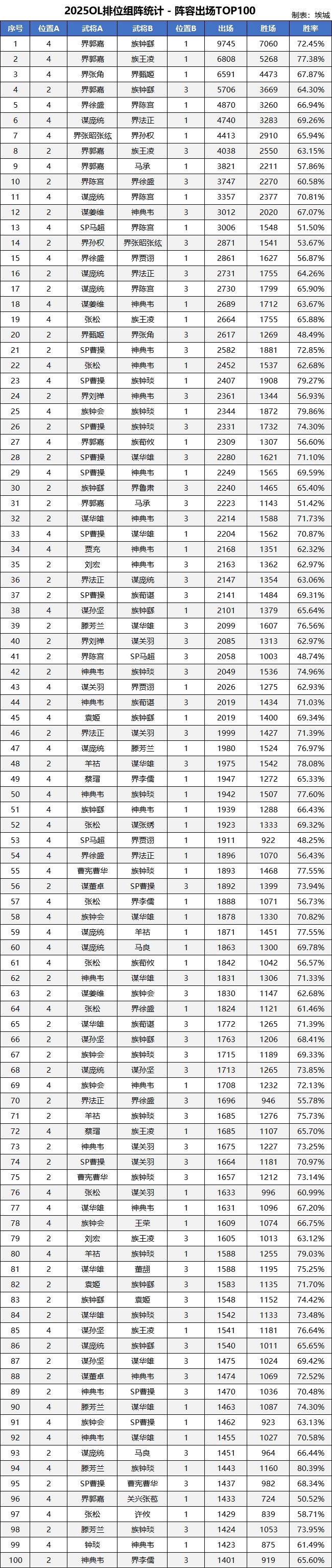 【排位统计】2025年高胜率组阵盘点