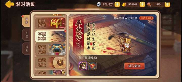 注:所有活动需更新至4.9.20及以上版本才能参加,请玩家及时更新最新版本,具体活动内容以游戏内为准。【活动1:平定江东】活动时间:2025年03月21日10点 - 2025年03月30日23点活动内容:活动期间开放平定江东副本,每日首通获得奖励。每日首通:徐盛碎片*2、兵旗*40【活动2:每日礼包】活动时间:2025年03月21日10点 - 2025年03月27日23点活动内容:活