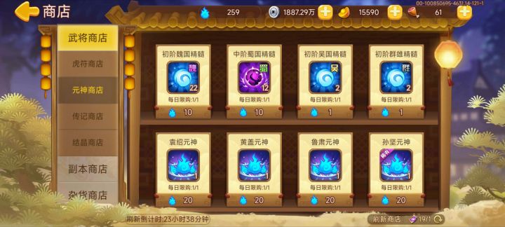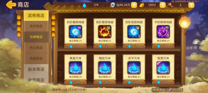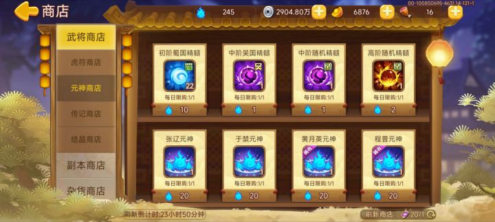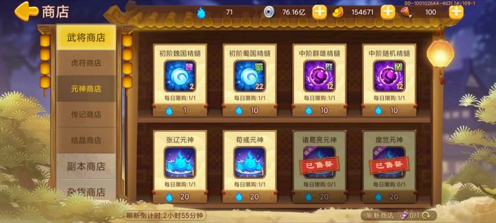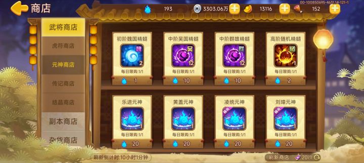 今日份元神商店,鲁肃快金了,买,另外就是总有人说,我刷新券留着干嘛?为什么总买那些很常见可以白嫖到金的元神,刷新券我基本上是不用的,因为我觉得真的没有必要去为了买34个稀有,放弃掉10多个5结晶,真的没必要,我把那10多个5结晶的弄成金的,再继续买了拆,不香吗?我不刷新,而且我每周都买夺宝礼包元神碎片才够,刷新我肯定会买那些快金的5结晶,而且每天买5结晶顺便买买7结晶这样攒结晶的速度不快吗?为什么非要去纠结只买7结晶拆呢?两三天出一个,两三个月可以把一个7结晶弄成金拆了吗?不大可能吧,而且7结晶的元神我都不知道有哪些,之前有人跟我说曹仁是7结晶,自那之后我就一直买,现在还没+2