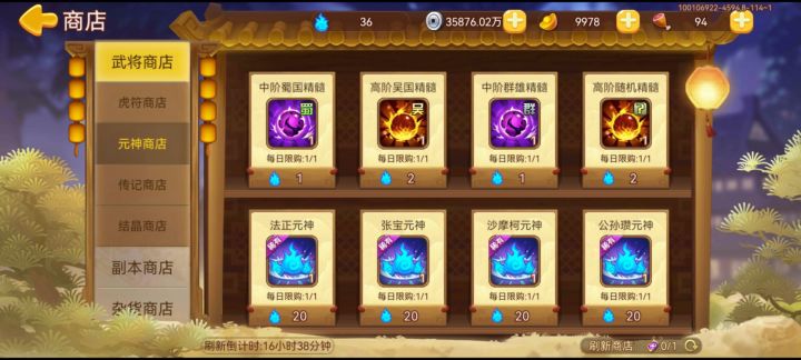 无欲则刚,解锁豪杰换个马超元神,解锁英杰后换个吕布元神,贫民最强物理伤害的有了,武将百分比伤害的也齐了,都说版本法师最强,庞统曹植也能出场了,游戏335天,26周目,除了北伐以外其它副本活动都可以躺着过了。有元碎和元宝充足的话元神商店还是要多刷新的,一次四个元神,除了确实脸黑的基本上还是能出好东西的,我周瑜孙策南华都搞了三四个了可惜不能用,或许有人会元宝堆资源优先装备升星,各人玩法不同侧重点也不一样,我套装都没突破五星的,资源慢慢积累元神天天刷新,天长日久的最终结果都一样