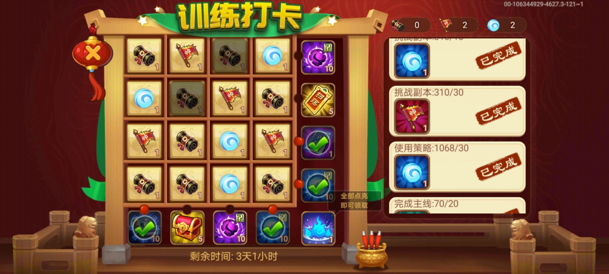 训练打卡任务,里面任务全做完了,怎么还有俩个不能点亮,拿不到张飞元神呀。求助