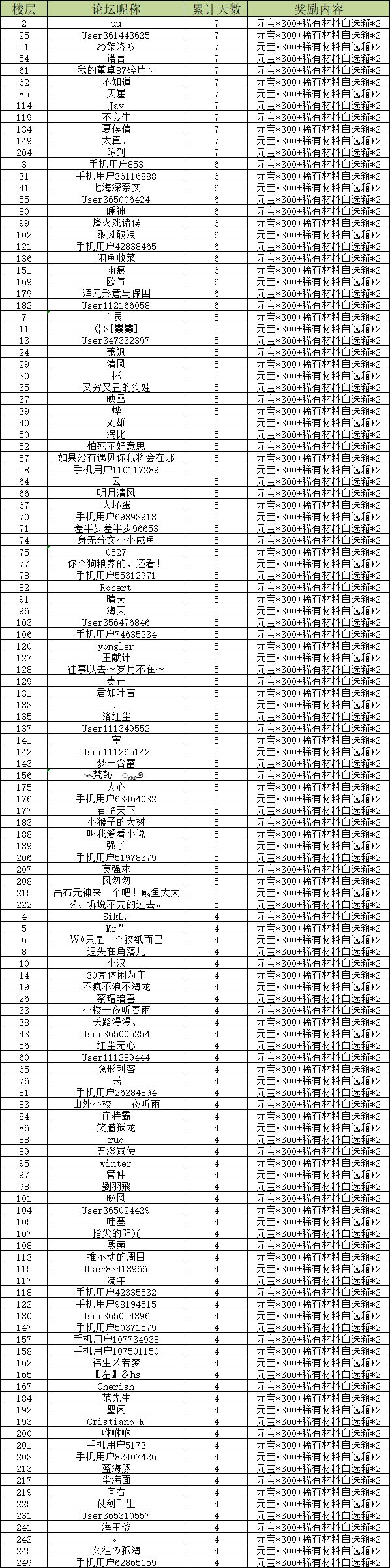 感谢各位主公大大的支持与参与,2021端午活动「第一弹」圆满结束,以下是本次签到活动的获奖名单!(鼓掌~)⭐本次活动的时间为2021年6月8日至2021年6月14日23:59,按照活动规则进行打卡签到且在有效期内累计满4天的主公大大可获得奖励“300元宝+稀有材料自选箱*2”。※:若对结果存有异议,请大大在仔细阅读活动【参与规则】和【注意事项】的基础上,确认自身符合要求后,在评论区截图评论反馈
