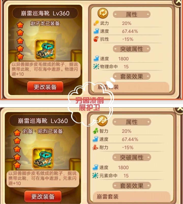 大家好我是渣渣新手展护卫,距离上次出新深渊兽套装已经时隔一年。新的套装崩雷套,随着版本更新也已经加入游戏,下面就来个大给做个简单的介绍吧。首先,该套装跟狼套兽套一样,通过幸运转盘使用兵者符获取,可转换成武力套或者智力套,物法双修;下面就先来看看每个部件的属性吧。1,崩雷巡海鞋,20%武力/智力加成,10物理/元素闪避;突破与其他战鞋效果一致,10星1800速度与物理/元素命中15。突破5星即可