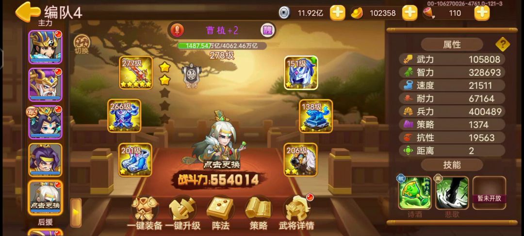 主C大概需要49W智打侵蚀精通的五星百川,刚开始过就是49W智左右。头盔附魔击破加侵蚀的,我的附魔就蓝色。重点是在四号位主C伤害加前边辅助伤害能刚好击破弱点,加20侵蚀大大提升侵蚀概率,侵蚀越多打的越快。副C五号位七星套;蔡文姬2+2月光套,能在击破弱点开大。或许诸葛带七星更好,但我诸葛曹植互换之后,曹植的智力太低不够击破弱点,不能加侵蚀概率和让五号位增伤。我阵法六级鹤翼或八级长蛇。#攻略#游戏讨论