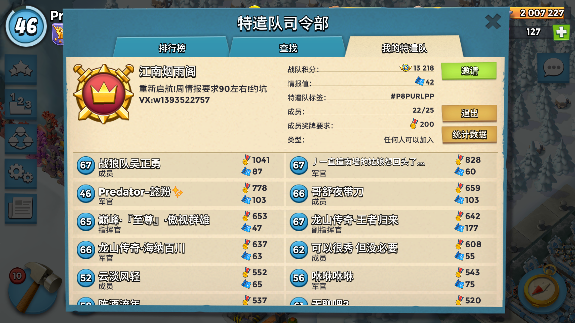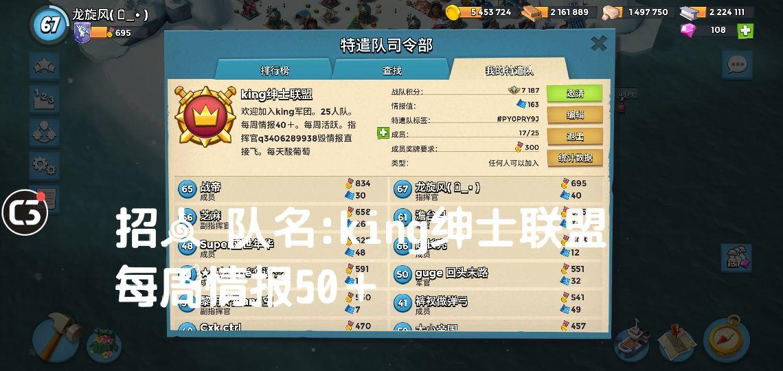 队名;king绅士联盟 25人队每周情报50+ 招情报手妹子大神,活跃玩家 一起玩一起分享战略