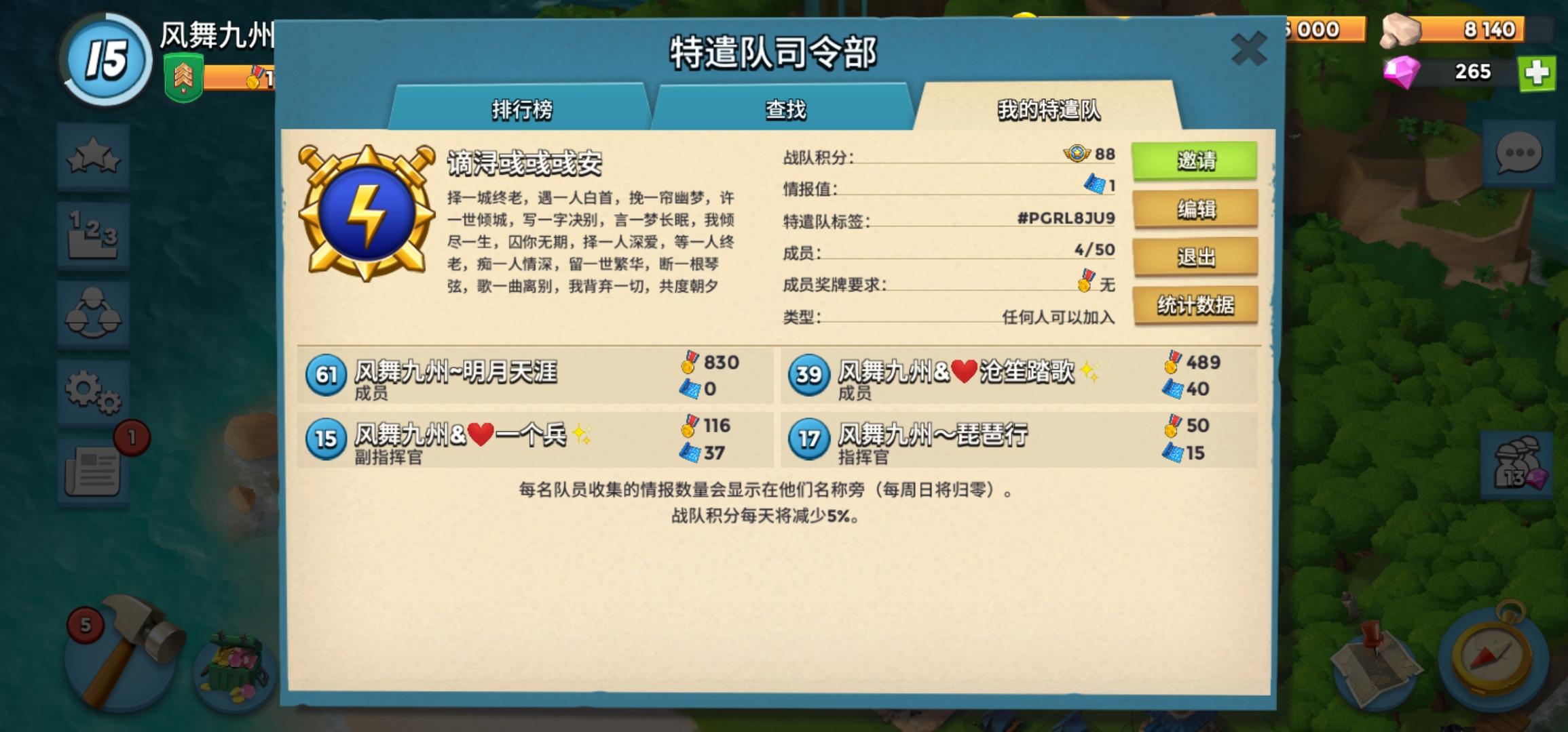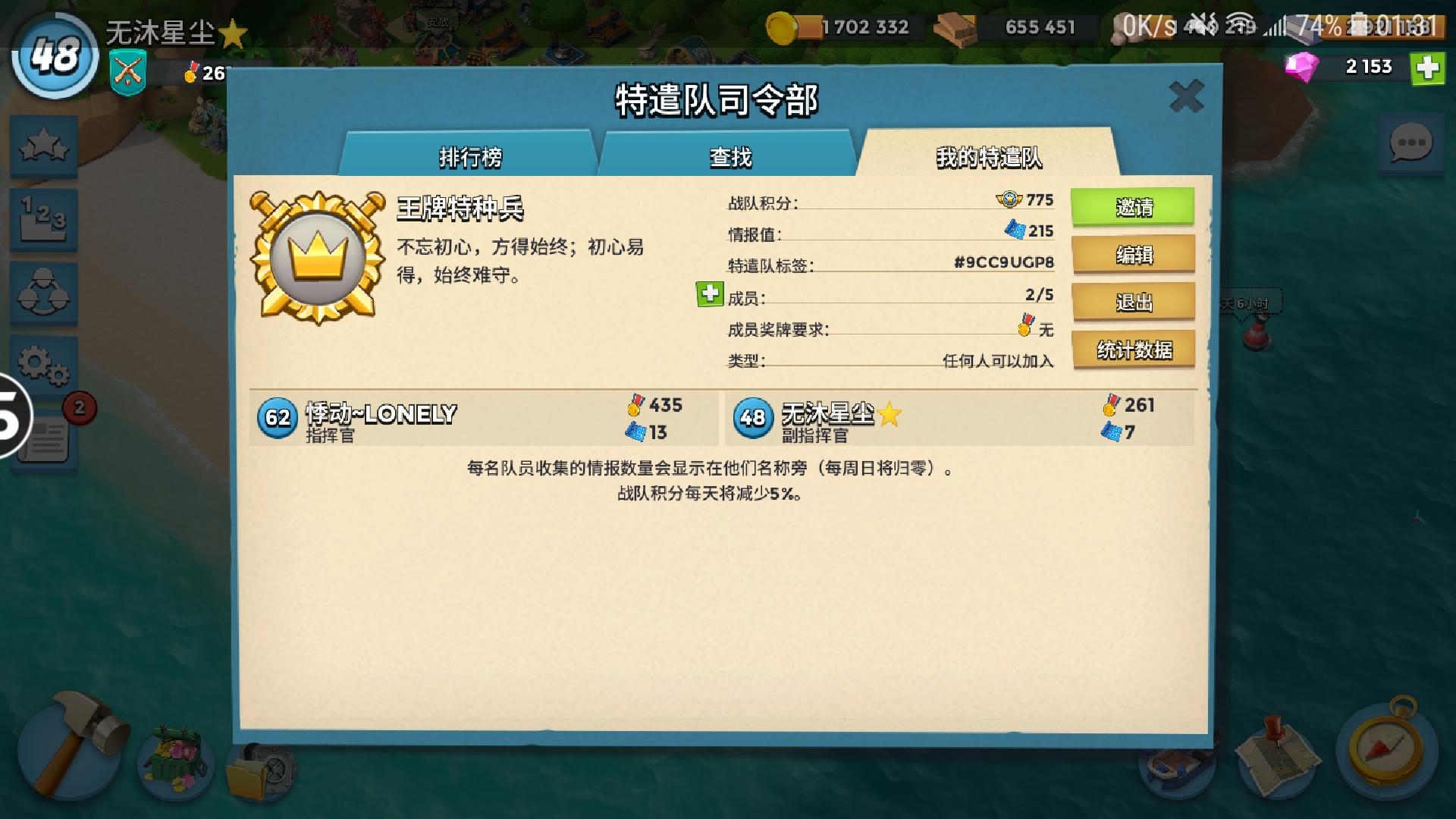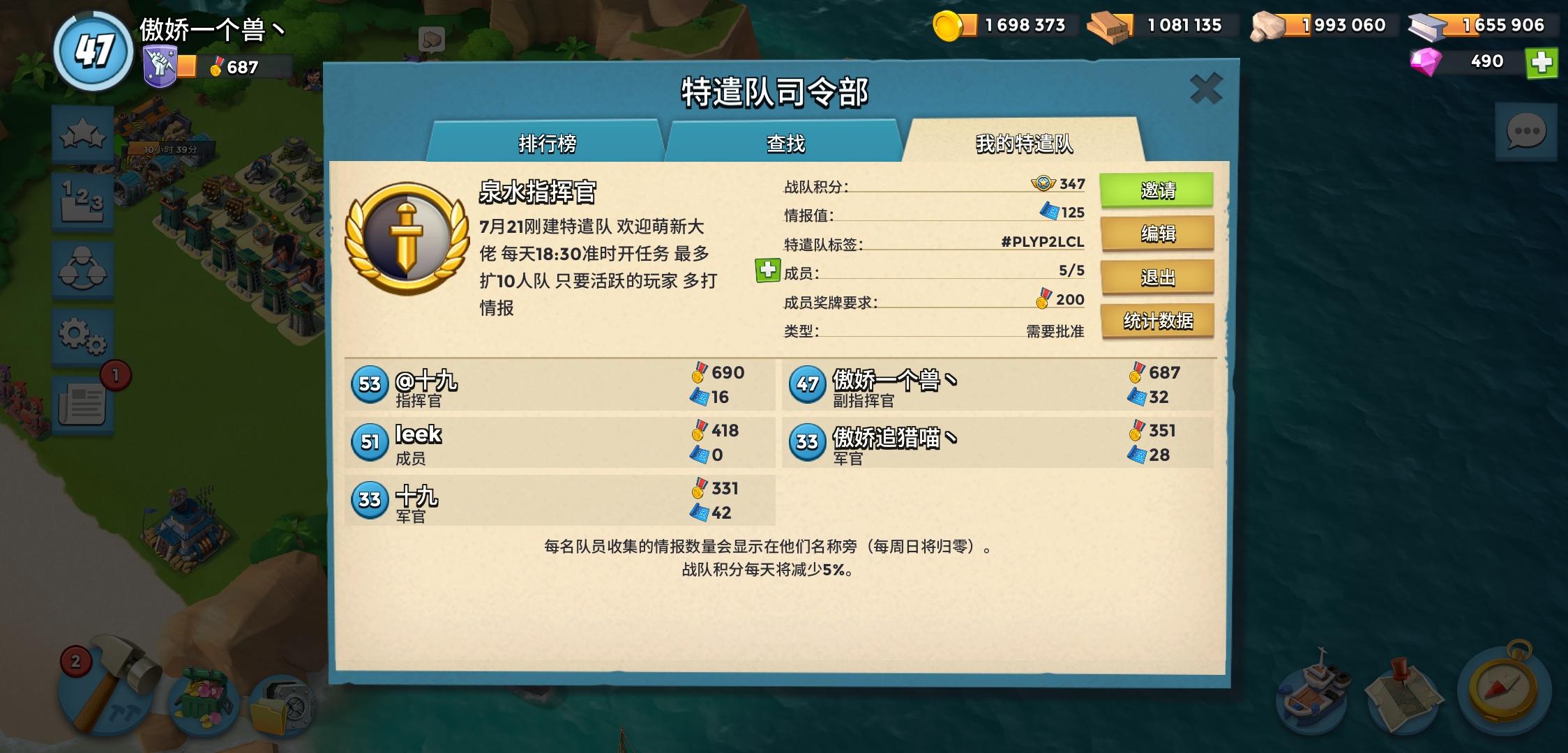 来加我们海岛奇兵,特遣队,我们这里非常活跃,全天在线人数达到20人,周情报可以达到500,希望大家都能加入😃😃