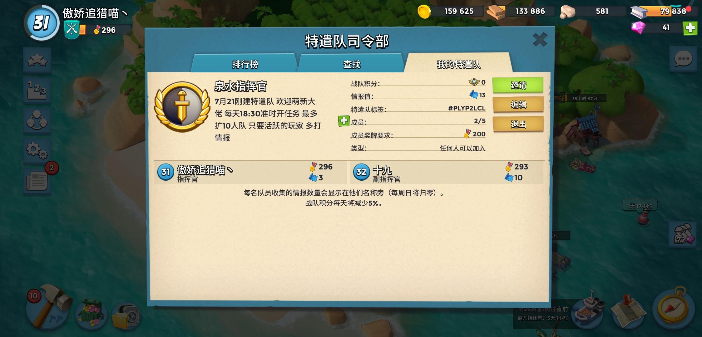 小队招人 目前五人队 很活跃 每天下午6:30准时开任务 可以一起聊天有群 不喜欢人多的可以来我们这 只要活跃玩家!!