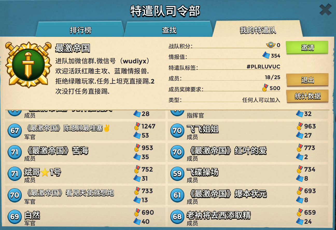 删除 原队解散、新建25人队 已有18老队员(稳定活跃),目前缺3人 要求:1.情报稳定100.主攻手.任务稳定在线 2.入队进微信群.愉快交流 /主开欢迎战友加入,留言或+v15050534770