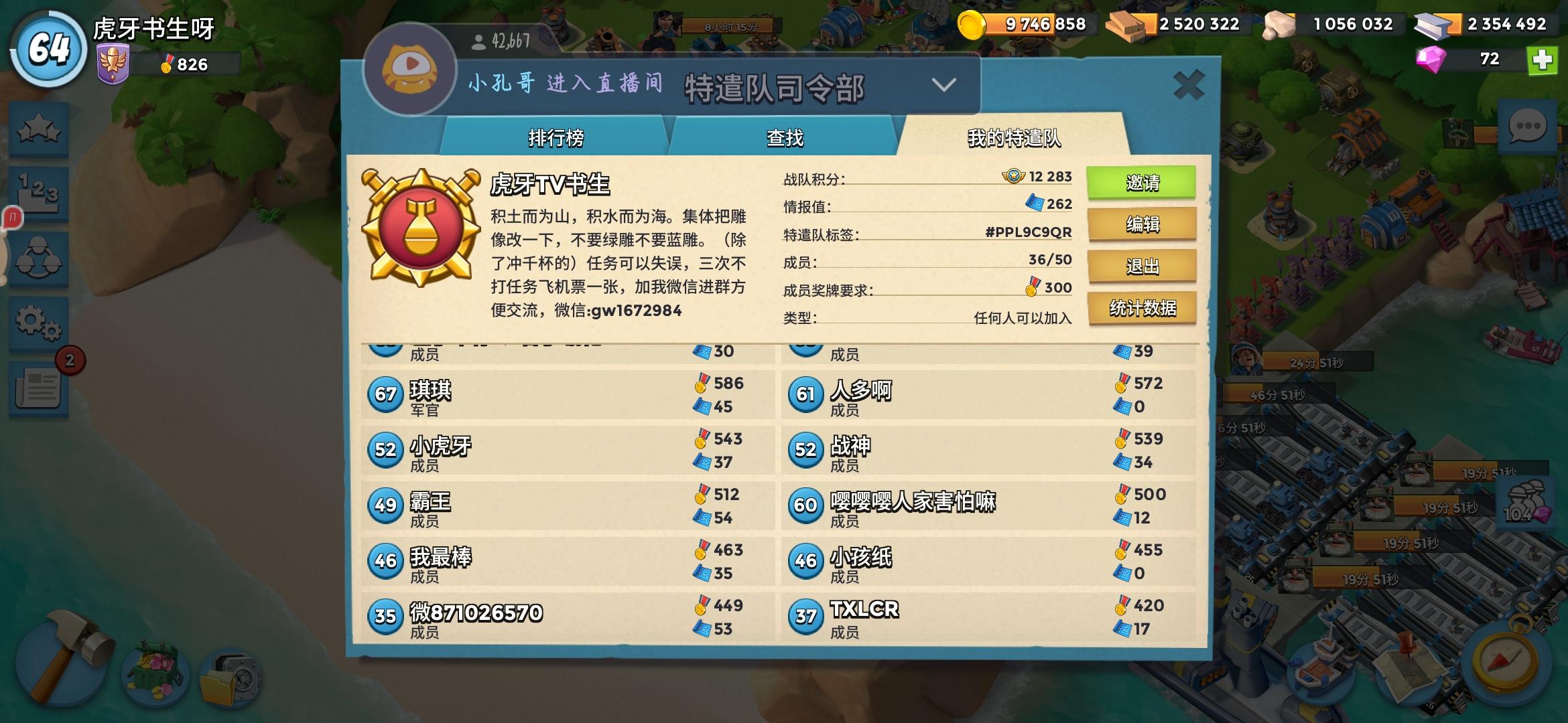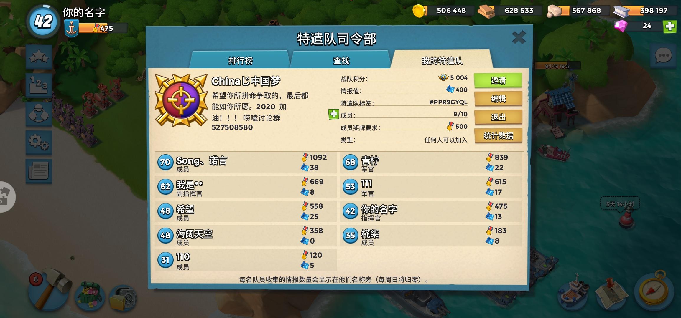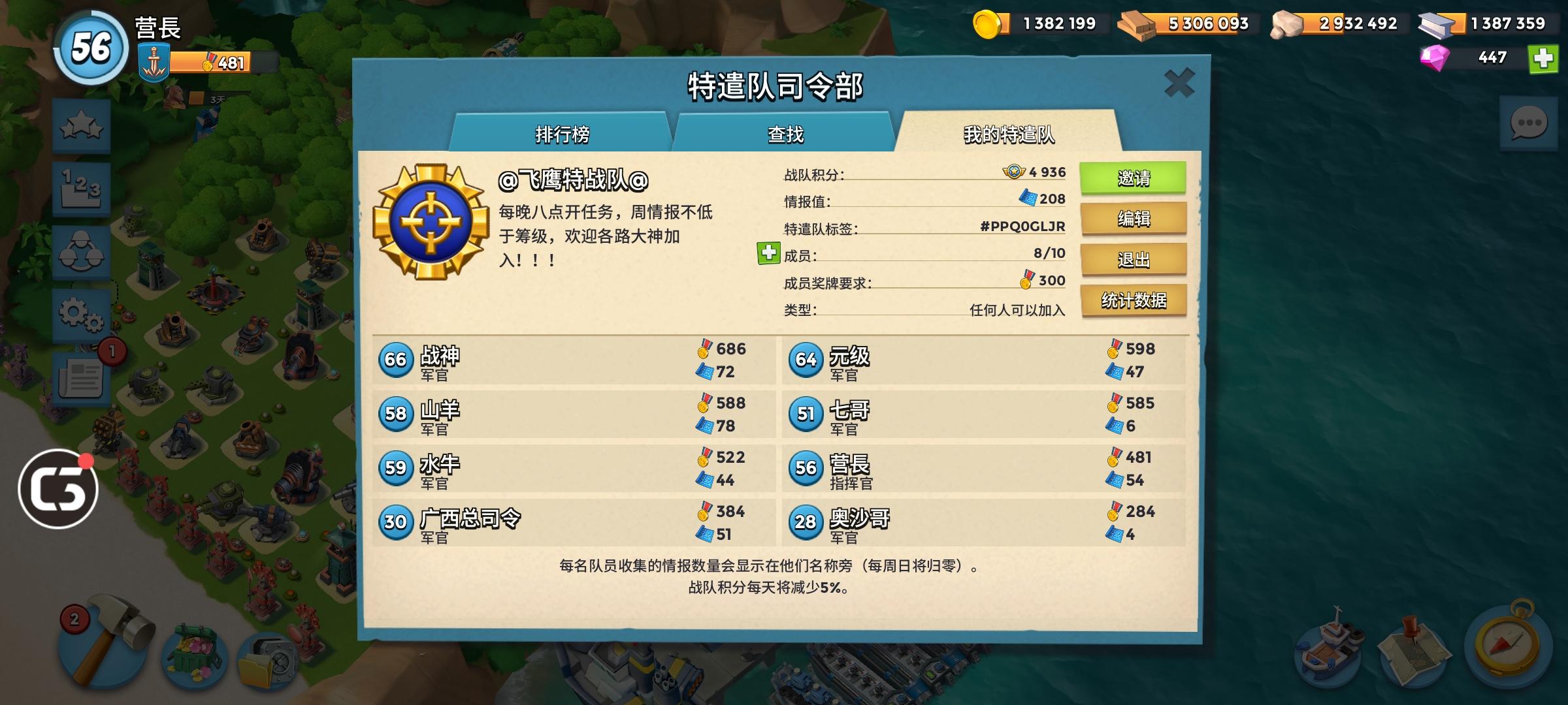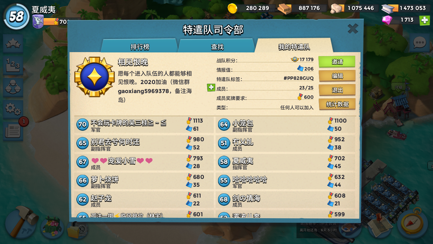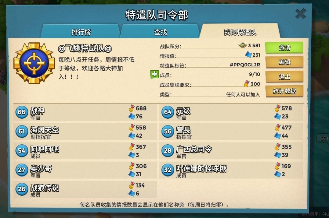 队伍名称:相见恨晚队长:夏威夷标签:#PP828GUQ队伍人数:25(后面会陆续扩招至50人 )加入条件:每日打任务,加微信群,周情报60+,600杯,若能单收200+积分的图无情报要求公会简介:愿每个进入队伍的人都能够相见恨晚。现阶段开咽喉岛27钻,缺大神,2020加油