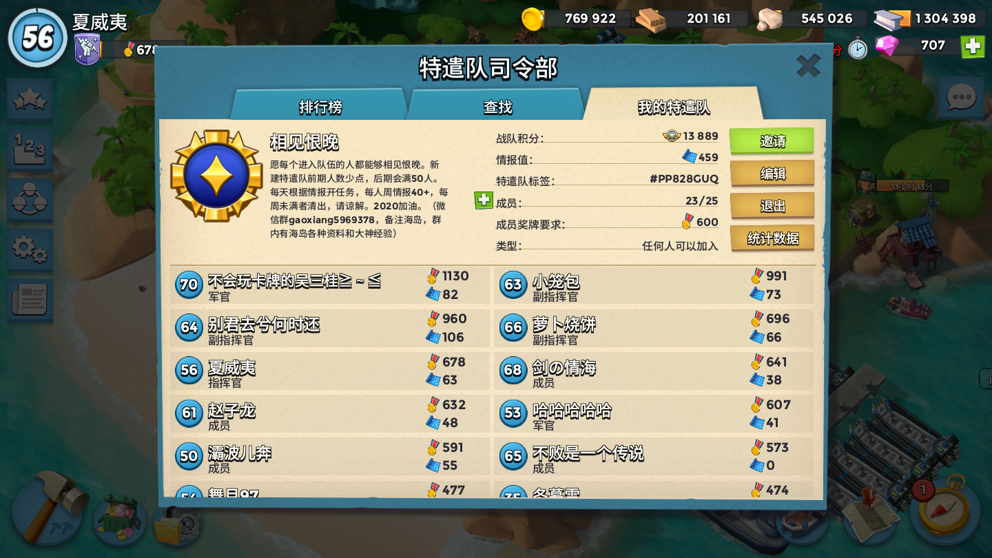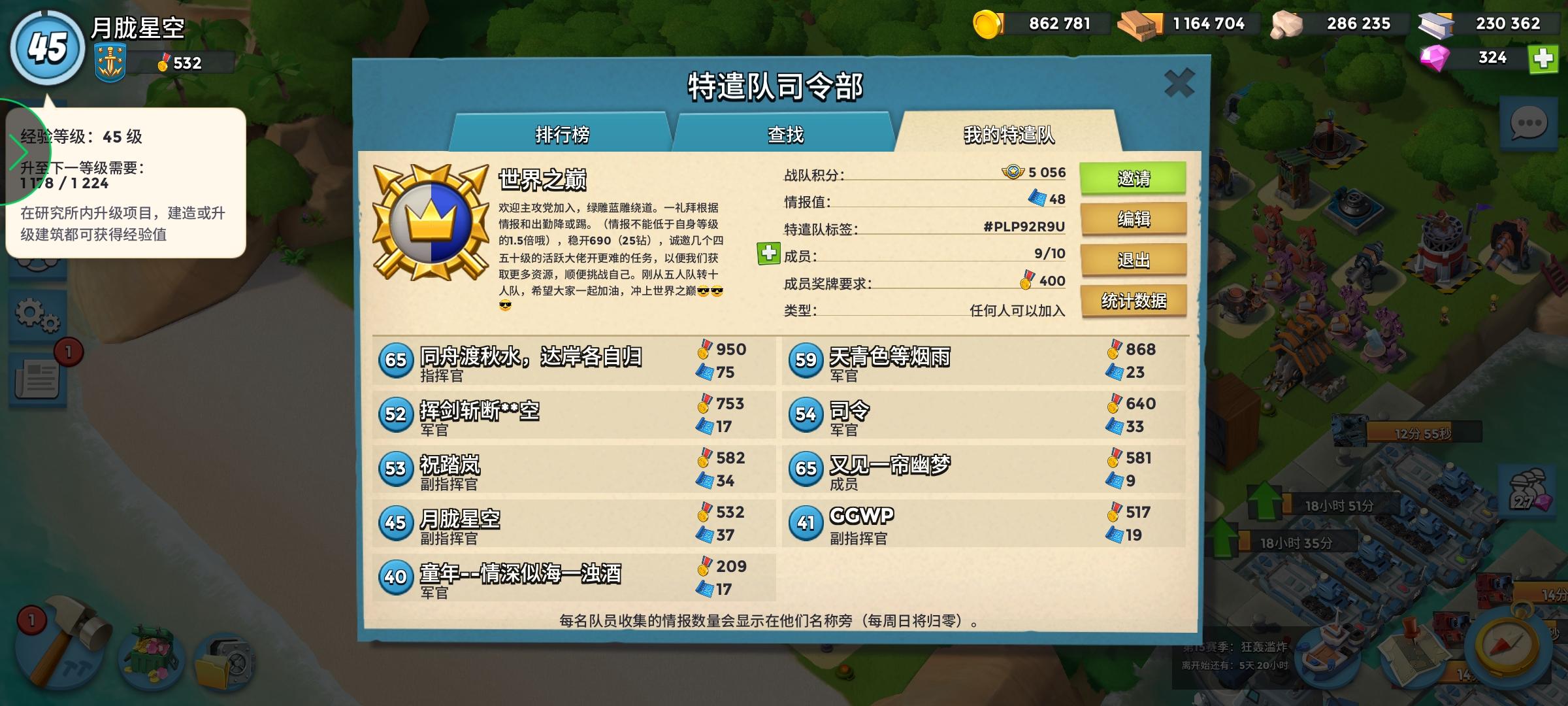 队伍名称:相见恨晚队长:夏威夷标签:#PP828GUQ队伍人数:25(后面会陆续扩招至50人 )加入条件:要求活跃周情报40+,600杯,特遣队任务必须打,招大神,大大神,大大大神,欢迎话痨公会简介:愿每个进入队伍的人都能够相见恨晚。新建特遣队前期人数少点,后期会满50人。现阶段开要塞25钻,缺大神,2020加油