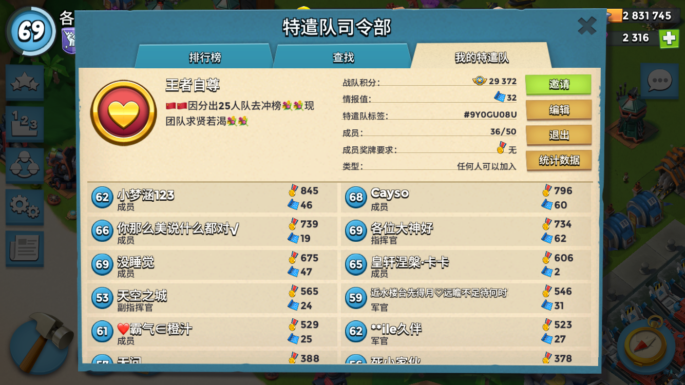 队伍名称:相见恨晚队长:夏威夷标签:#PP828GUQ队伍人数:25(后面会陆续扩招至50人 )加入条件:要求活跃周情报40+,600杯,特遣队任务必须打,招大神,大大神,大大大神,欢迎话痨公会简介:愿每个进入队伍的人都能够相见恨晚。新建特遣队前期人数少点,后期会满50人。现阶段开要塞25钻,缺大神,2020加油