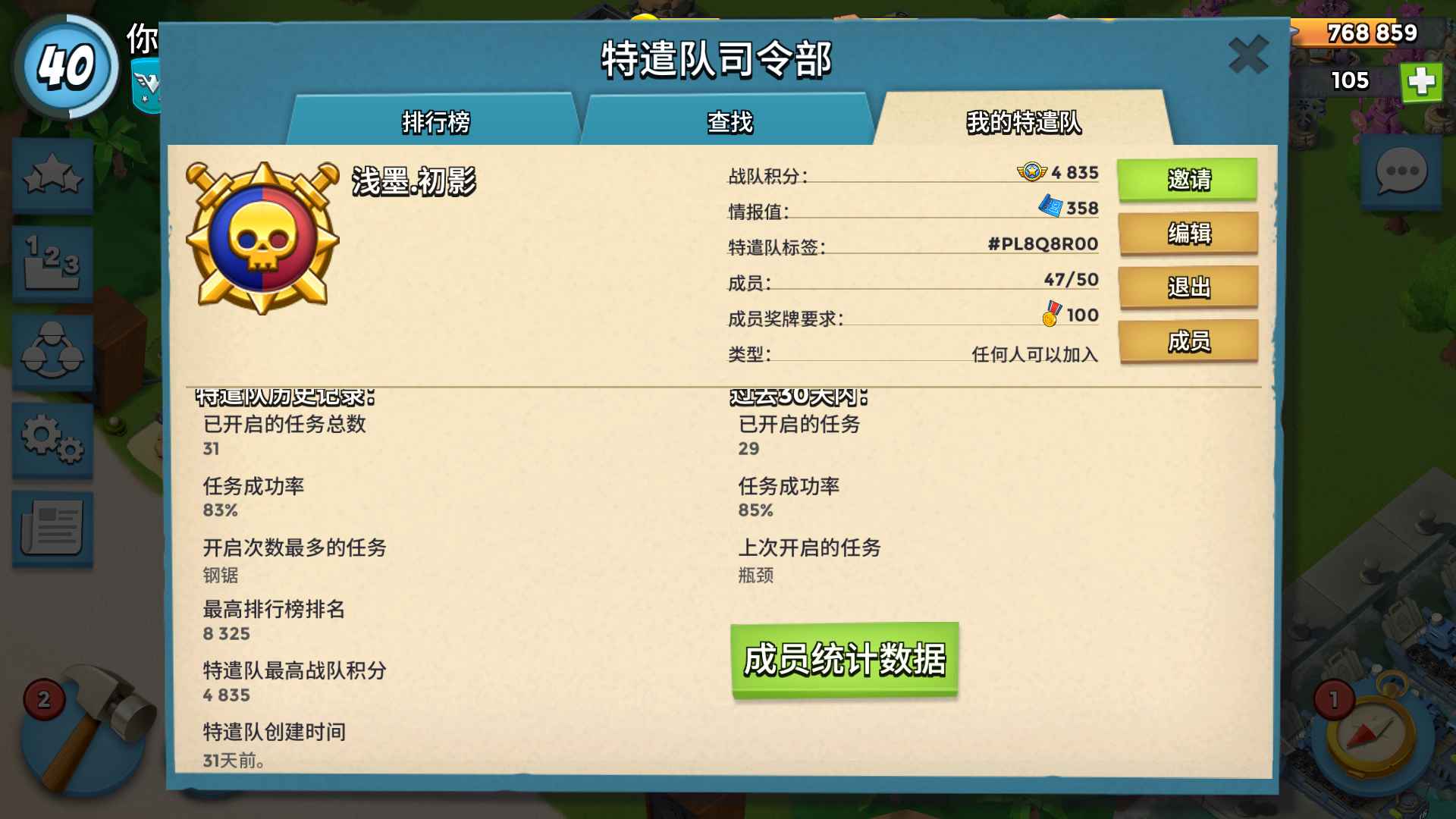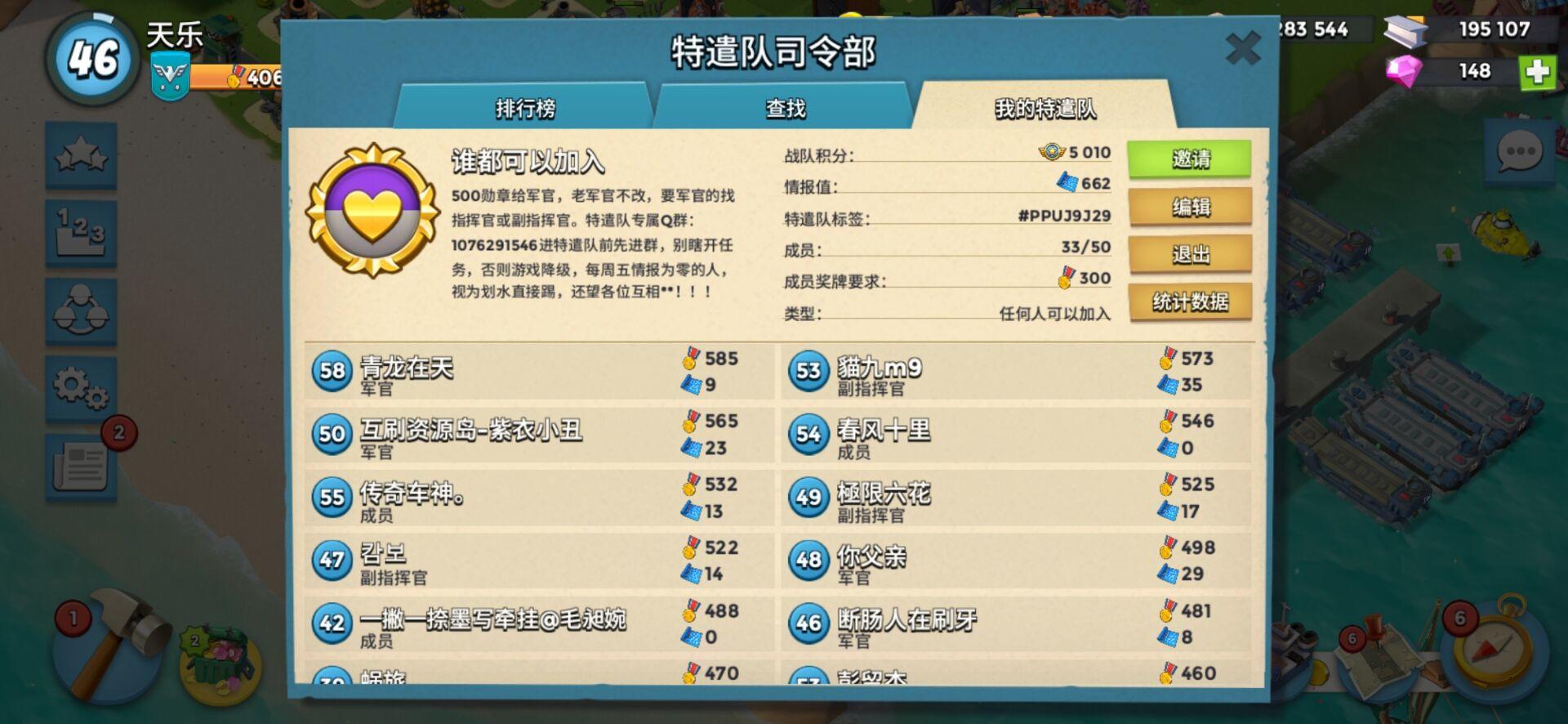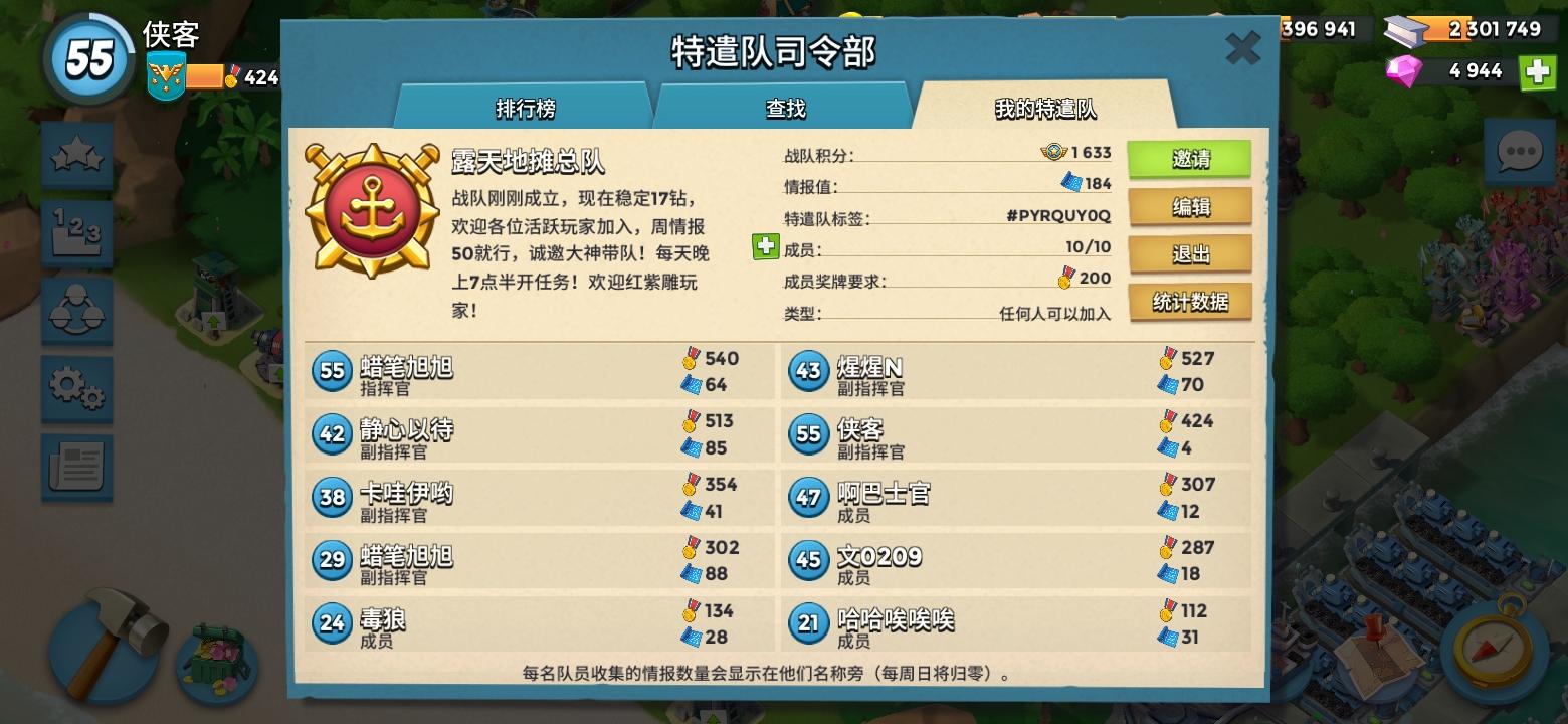 特遣队收人,本队很活跃,刚创队31天,每天稳定18钻,有时打的好19 钻。等级不限,只要有情报就可以 。欢迎大家加入