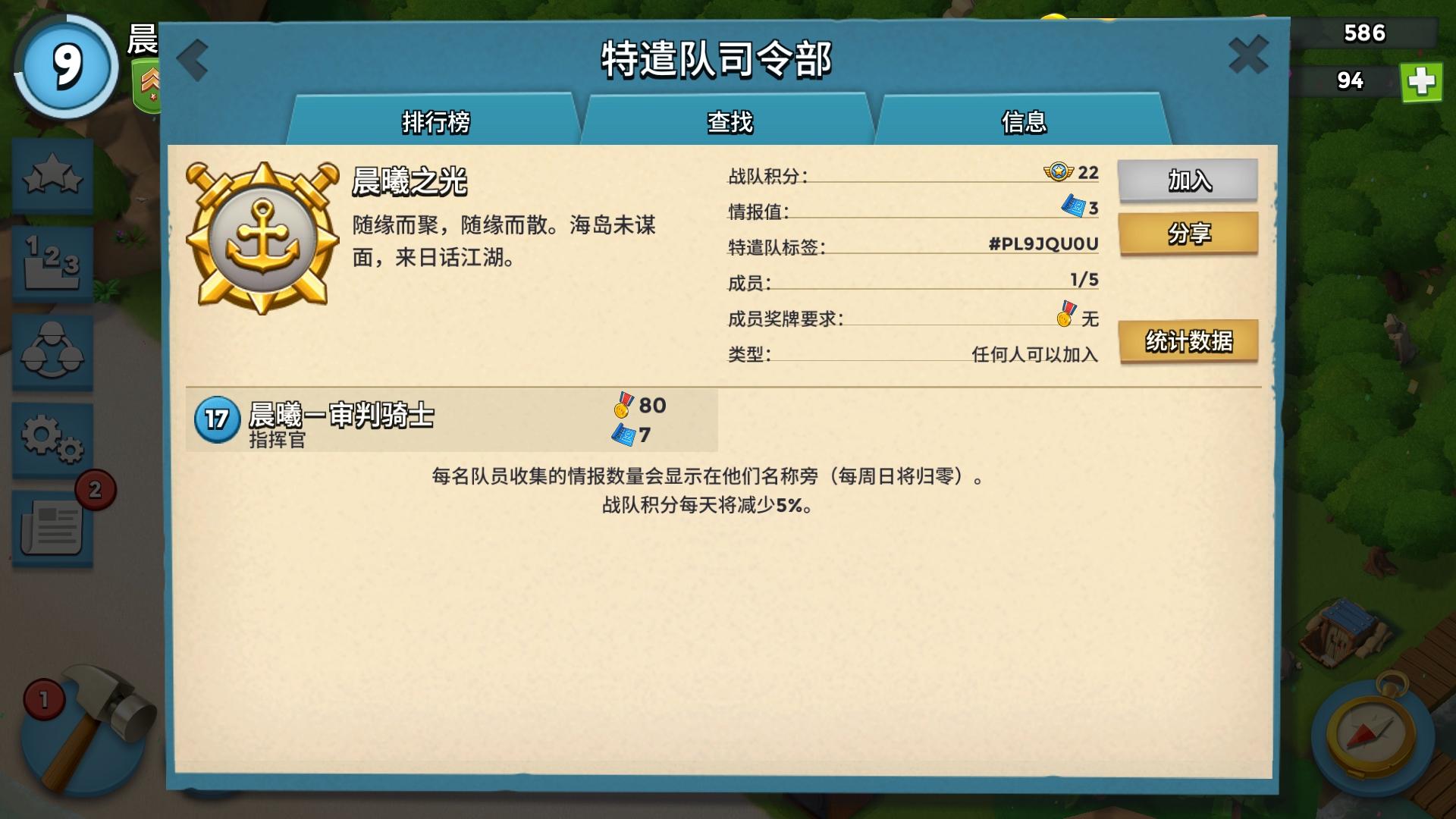 本人新建一个特遣队——晨曦之光,现22战队积分。诚邀各位新手,老手朋友们加入。一起建造,让它在我们共同的努力下,做大做强。本特遣队不强留人,大家凭缘分聚在一起。想走的时候大家可以互相开心的道别。不必有任何的负担。(当然,本人大号玩的也比较久了,自己有一些小经验,也可以帮一下萌新。但是大号在朋友的一个战队,不太好退出来,但是我有时可以零时加入我们这个战队来打一下任务。)特遣队创始人:晨曦—审判骑士