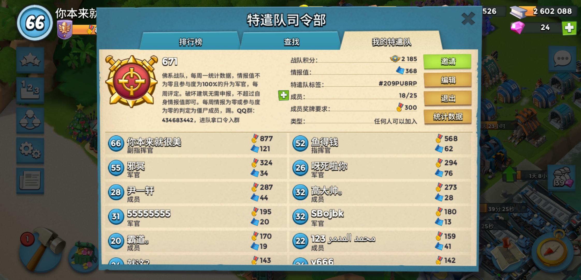 特遣队名称:671司令:鱼得钱队伍人数:25加入条件:300沟通群号:434683442 (QQ)公会简介:66级大号带领,每天特遣队任务