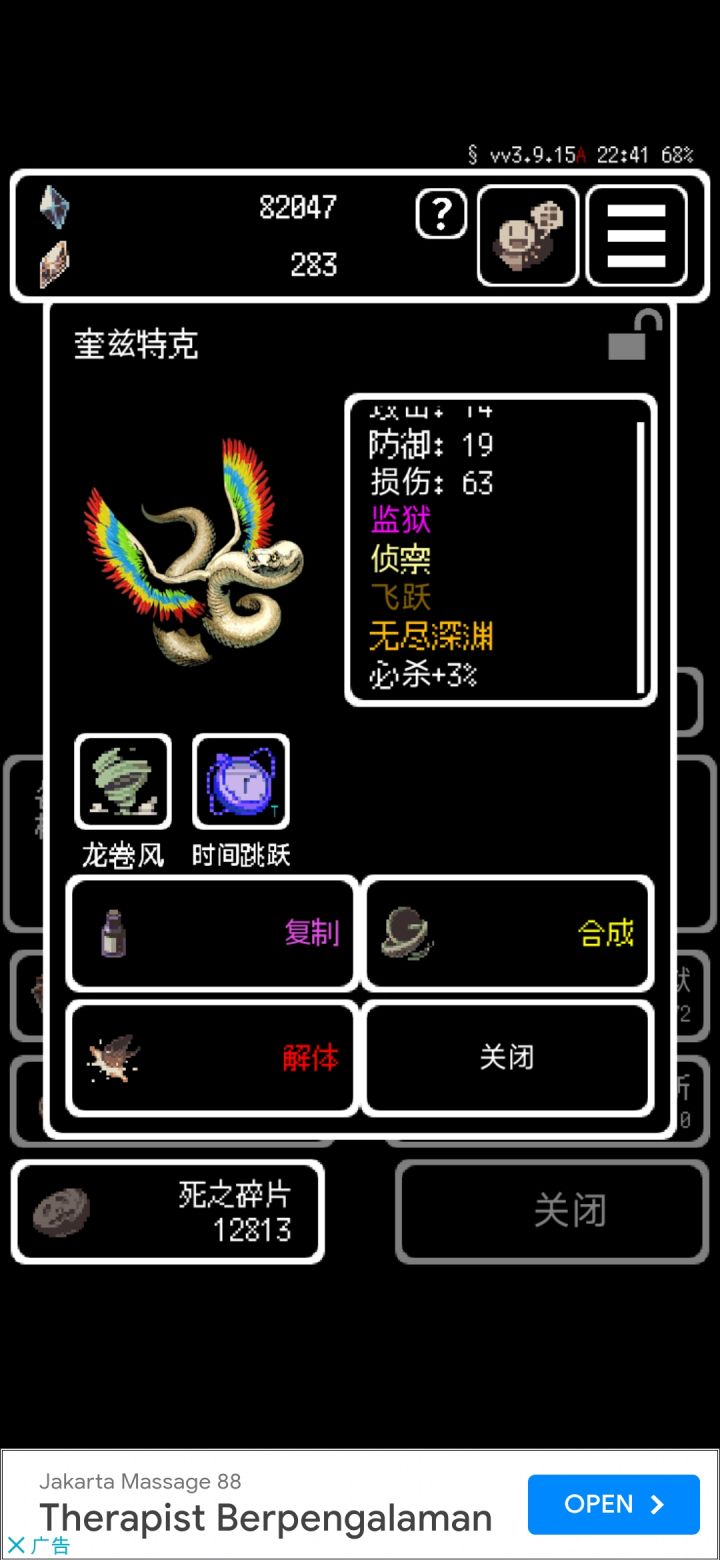 新版本我依旧推荐小丑,护身符还是古老宝盒,但是携带品推荐不给糖就捣蛋,这个可以回血而且还给50回合的育成,实验室插件推荐无尽深渊,精神力(无视混乱),血护甲(不怕石化),调查(可以看见事件好坏),最后一个我带的捕捉。魔之契约我推荐暴风雨或者轻飘恶臭。传送,侦查。前期通过无尽深渊多刷点属性,后期boss随意杀,都是一回合死。任何目的地都能打。