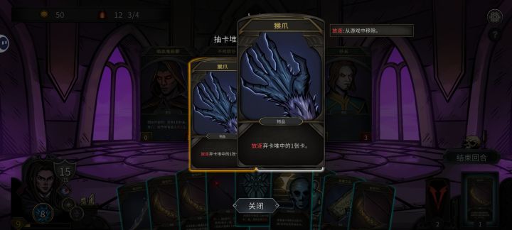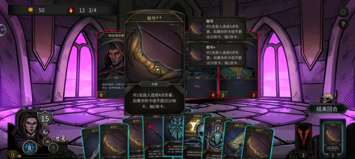 总结:由于抽牌堆与弃牌堆之间没有禁行惩罚,所以理论上可以无限过牌。尽量精简卡组,在战斗中用轻弓实现无限过牌,实现一回合清怪。同时为了保证下次战斗首回合就抽满至手牌上限(手牌上限9张),所以战斗中多用弯刀。战斗后无怪但仍能使用部分卡牌(不指向怪物类卡牌都可),在战斗后用魔杖+冰盾实现休养生息。解释部分:保证卡组≤20张,所以一般情况下维持在10-15张即可,剩下的空间留给宝石或者其他临时