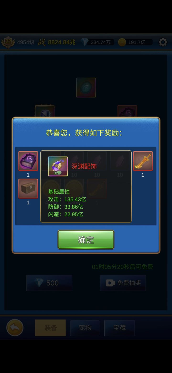从1000兆到10000兆历时3个月,升了500级到了满级5000反馈问题1:4950级后寻宝找到的深渊饰品是32阶的,没有31阶,31阶饰品只能从商店买问题2:5000级后无法通过战斗获取5000级别装备,寻宝出的装备宝箱都是空的,只能从商店买装备32阶饰品都准备好了,是不是该出新功能了