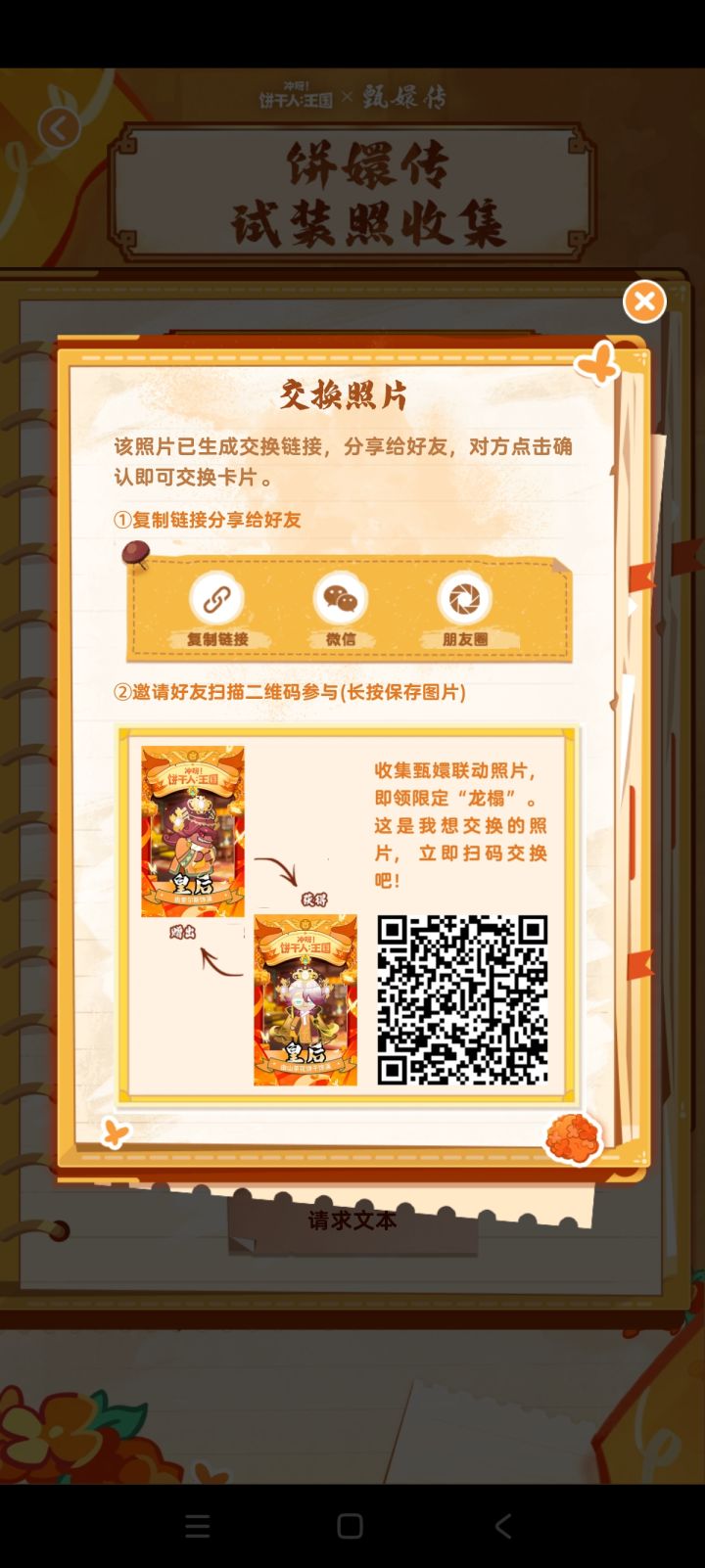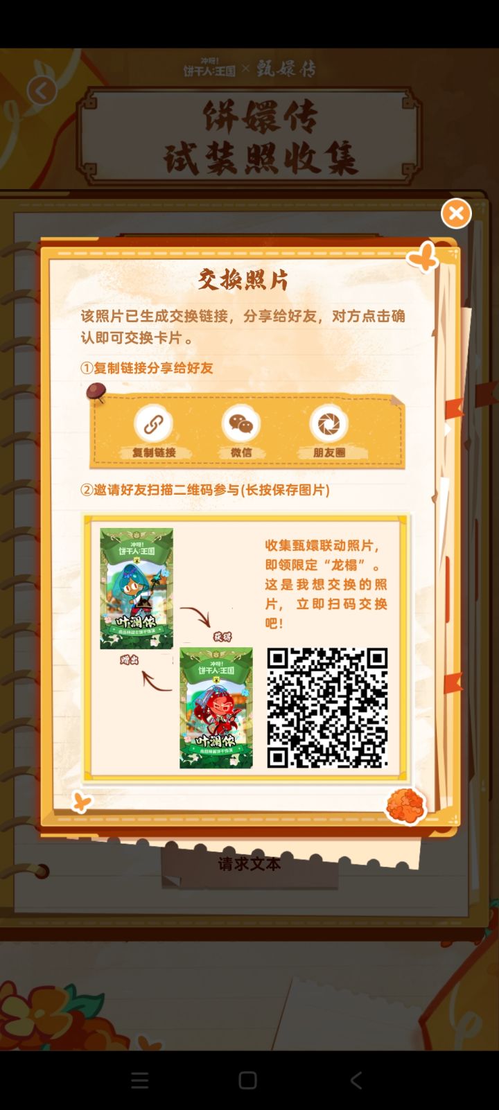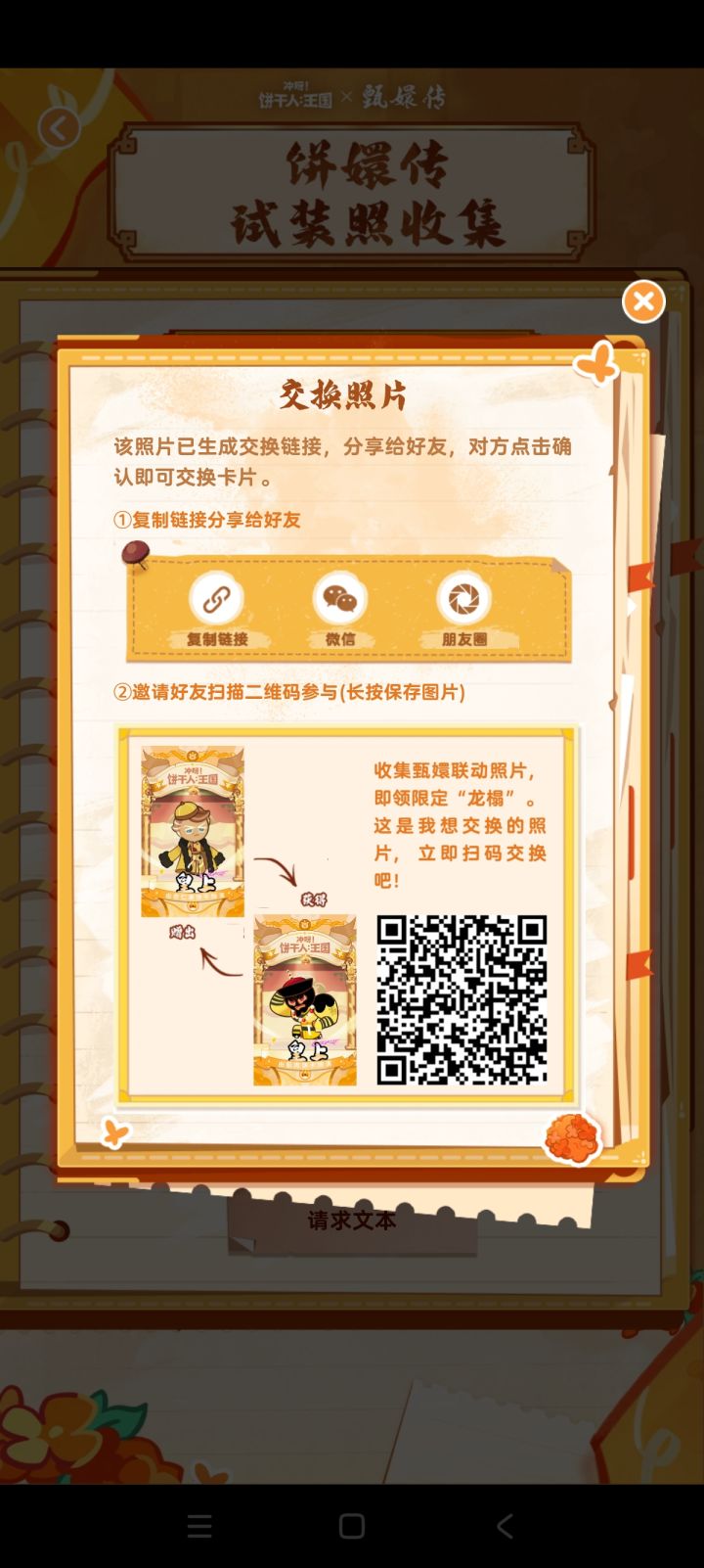 #冲呀饼干人王国 亲爱的朋友,可以与我交换《冲呀!饼干人:王国》与《甄嬛传》的联动照片吗?我可以用来交换的卡片种类:甄嬛·惊鸿舞饰演甄嬛(2);肌肉饼干饰演皇上(2);丹桂饼干饰演华妃(2);狐妖饼干饰演华妃(5);沈眉庄饼干饰演沈眉庄(2);金桂饼干饰演沈眉庄(5);黑莓饼干饰演沈眉庄(5);查尔斯饰演皇后(2);山茶花饼干饰演皇后(2);公主饼干饰演浣碧(2);紫蘑菇饼干饰演苏公公(5)