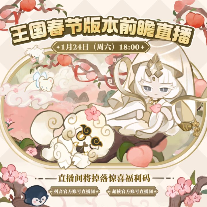 饼干朋友们好! 王国春节版本前瞻直播即将开启,邀请各位饼干朋友共迎新年! 1月24日 18:00,锁定官方抖音直播间!新版本内容路透、多重直播好礼、惊喜兑换码轮番放送,福利不停! 各位饼干朋友也可以在评论区留下你的问题与建议,我们将挑选部分在直播中现场“翻牌”解答,搜索抖音“冲啊饼干人王国”进入官方直播间,即可一键抵达直播现场。我们不见不散!